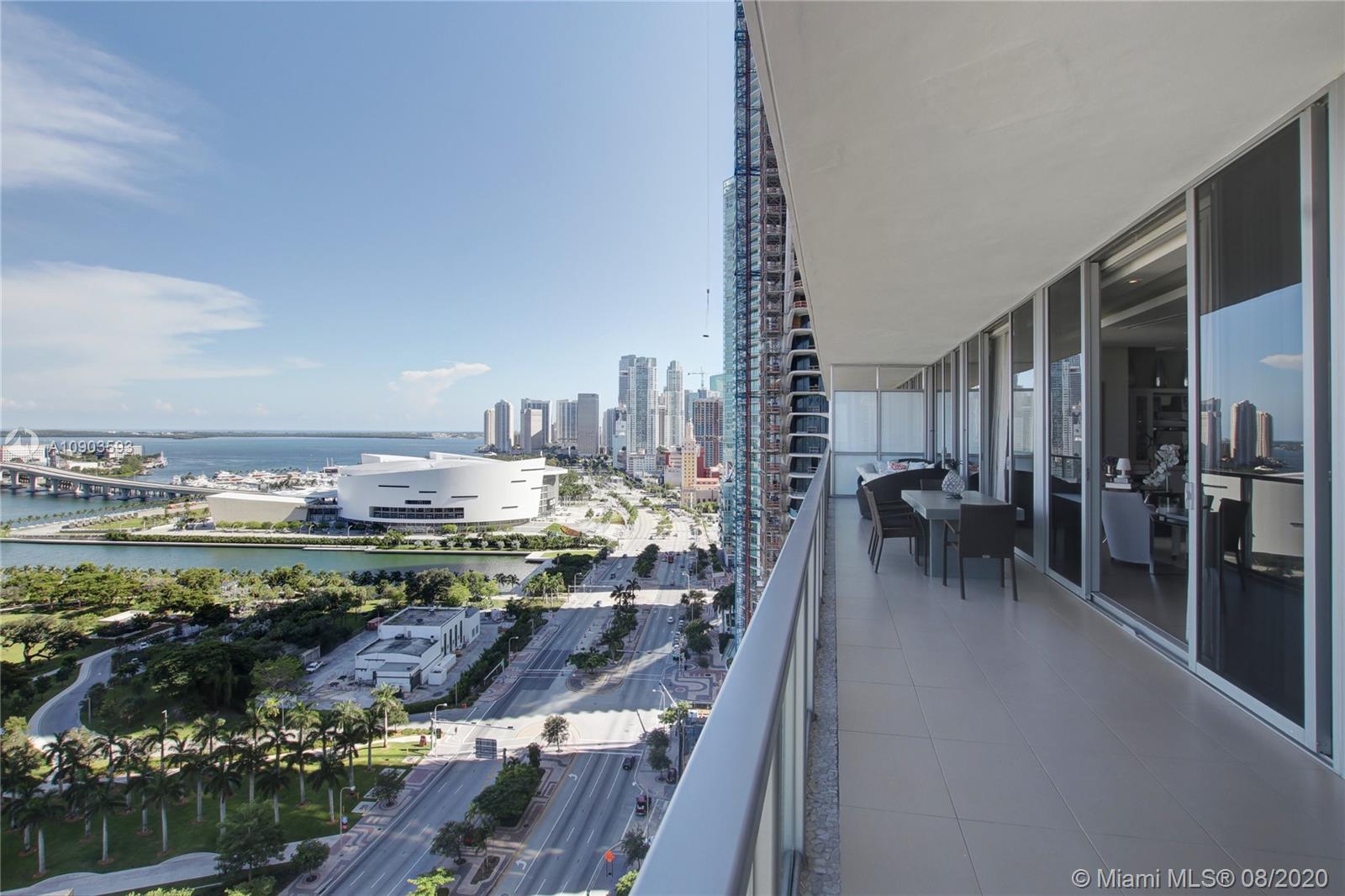The only one of its kind in the fabulous Marquis Residence.Transitional elegance is personified in this unique Residence.Open floor plan,unobstructed 180' views of bay & ocean.10' ceilings throughout.Three bedrooms (2 master suites),impact-resistant glass door & windows;extra-thick,noise reducing partition walls;porcelain tile flooring,Creston Audio,drapes & lighting,security system,Ilnear diffusers,European Style kitchen (Viking appliances) & quartz countertops,custom built in bar,cove ceiling with fiber optic lighting,private elevator,bathroom with over-sized glass-enclosed showers;24/7 doorman, bellman, security, valet & concierge;smart-building technology;signature spa & fitness center,open-air sky pool deck (14th floor) with hot tubs.Many services are available in building.