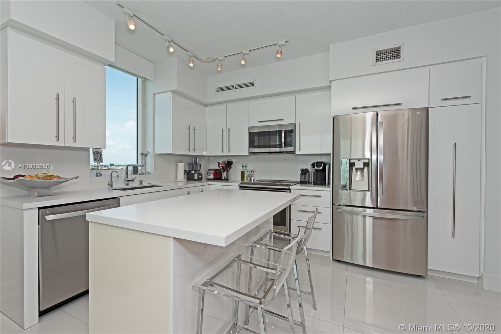 Luxury at its Best at the Desirable Resort-Style Living DUO Condominiums!!! Immaculate, Completely Remodeled Corner Unit Offers a Beautiful Contemporary Lifestyle. Gorgeous Open Kitchen, High Gloss Cabinets, Quartz CounterTops, High-End Stainless Steel Appliances, Movable Kitchen Island That Will Help You Rearrange Your Space in Seconds! Impact Windows and Doors. Customized Window Treatments, Fabric Sliding Panels, Fabric Wrapped Valances & Blackouts. Ample Master Bedroom, Custom Closets & Doors. Tastefully Remodeled Bathrooms. Sophisticated Built-In Banquette Seating in Dining Area. Elegant Porcelain Floors & Light Fixtures Throughout. Built-In Work Space in 2nd Bedroom. Amazing City Views From Your Wrap-Around Balcony. Newer Washer and Dryer. Resort-Style Amenities!! This is a Must See!!
