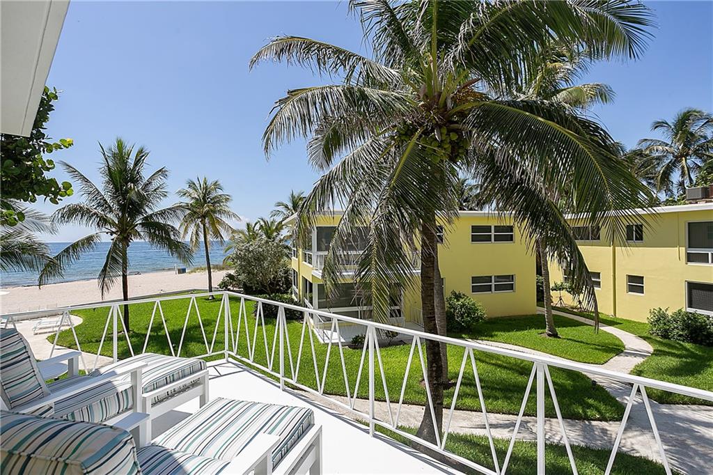 THE WAY WE WERE... True Old Florida Charm nestled Directly-on-the-Sand with MAGNIFICENT OCEAN VIEW! FABULOUSLY UPDATED 2-bdrm/2-bth co-op in secluded enclave of only 14 units. Get-out-of-the-cold Second Home? Or Tropical Residence in favorable low tax state! All New Interior with Top-line Appliances (Bosch, Fisher Paykel, Kraus), New Elec/Panel, State-of-Art Bath Fixtures; Driftwood Porcelain Flooring; Impact Windows; New Roof/Exterior Paint 2019; Covered Parking; Heated Pool in the Sun and Swaying Palm Trees all on one of the Nicest Beaches in the County - just minutes to Laud-by-the-Sea and Atlantic Blvd shops, restaurants and piers. BEAUTIFULLY FURNISHED Casual Florida Lifestyle. Concrete restorations to balconies, landings, stairs already completed 2017/18. Onsite Maint/Mgr, too