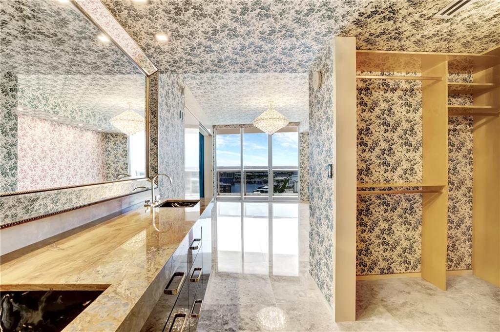 *EXTRAVAGANT GUCCI BEACH CLUB CONDO* This owner has spent lots of time and money, $170.000.- to create a "Gucci Boutique" look and the result is stunning. Custom made sliding doors open up the rooms and the kitchen looks more like a luxury bar with a beautiful marble counter-top. Original Gucci wallpaper, crystal chandeliers and remote controlled silk curtains. Polished brass fixtures, over sized marble floor tiles and vanities are marble as well and bathroom walls. Custom designed closets and a built in Murphy bed. New A/C ,washer, dryer, everything is brand new. Beach Club amenities include valet parking, 3 pools, a 2 story gym overlooking the ocean. Garage parking space right next to elevator and one free valet space. Come admire all the beautiful details this apartment has to offer!