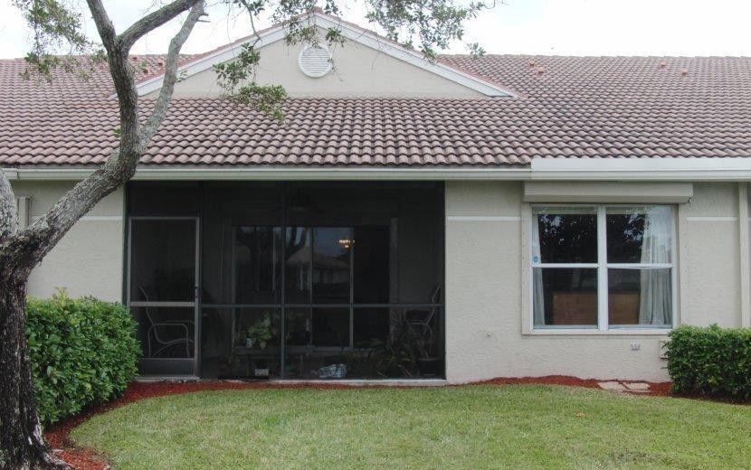 55+ community - Villa in resort style community, with beautiful lake views from living room, master bedroom and back patio. Features: 2 bedrooms; 2 bathrooms; Den enclosed with glass, French doors. Tiled, fully Screened patio with glass slider doors. Door to garage from kitchen, pantry, full size washer and dryer, ceiling fans, hurricane shutters controlled with remote, large driveway that fits two cars. Second bathroom has two entrances from hallway, and from the second bathroom. Pets allowed. Nearby Palm Beach Airport, highways, shopping, dining, beaches, golfing.