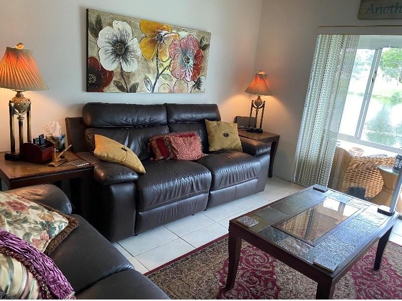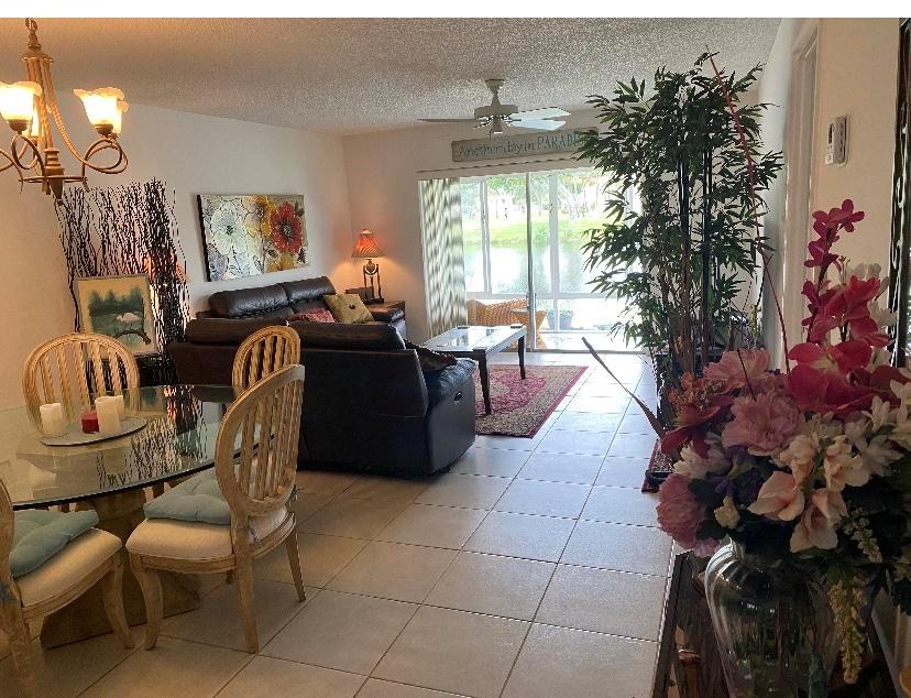 Spacious 2/2 Corner Villa. All tile floors throughout. Laundry Room inside unit. Enclosed back patio overlooking the lake.24/7 Guard gated security, Many amenities, Pools Saunas, gyms. Close to restaurants, City Place, Performing Arts, Turnpike & Downtown. Don't Wait! This 55+ community is waiting for you!