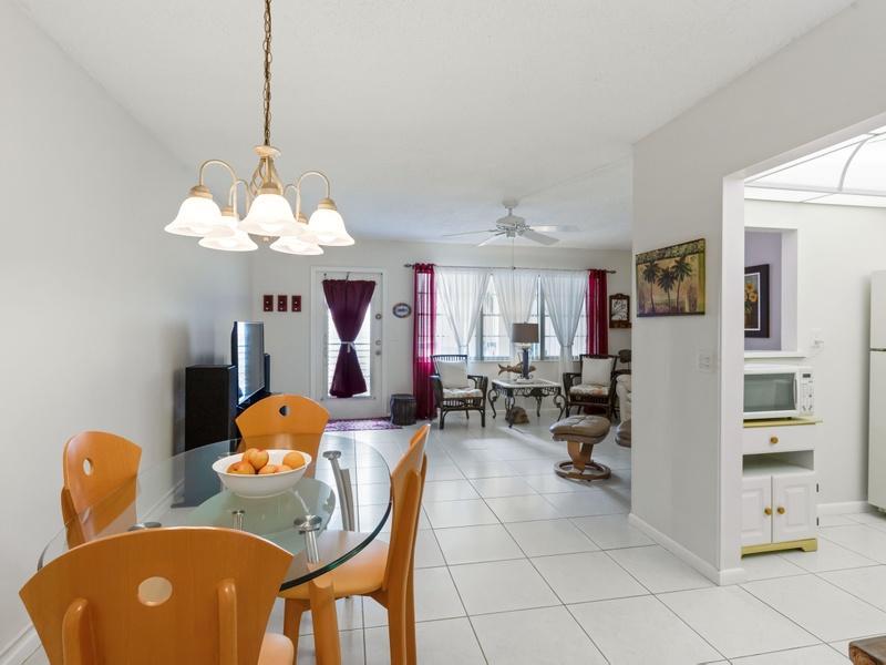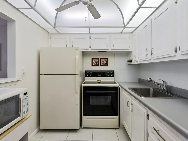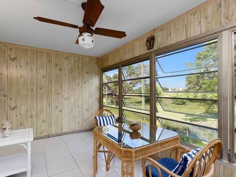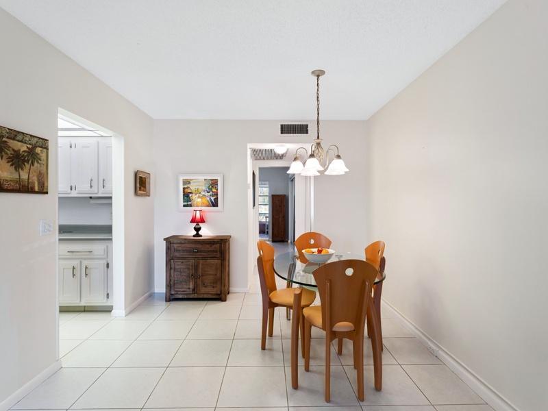 Beautiful and freshly painted in neutral colors, super clean 1 bedroom, 1 1/2 baths condo. Large tile everywhere, all tiled bathrooms, shaker style kitchen cabinets, accordion shutters for complete hurricane protection, large enclosed Florida room with a storage area. Sold turnkey with very nice furniture. Florida room table and chairs excluded from the sale. Directly across from pool. Located in Century Village, a 55+ community w/ clubhouse, pools, fitness center, bus transportation, theater and more to enjoy. No pets. No rentals.