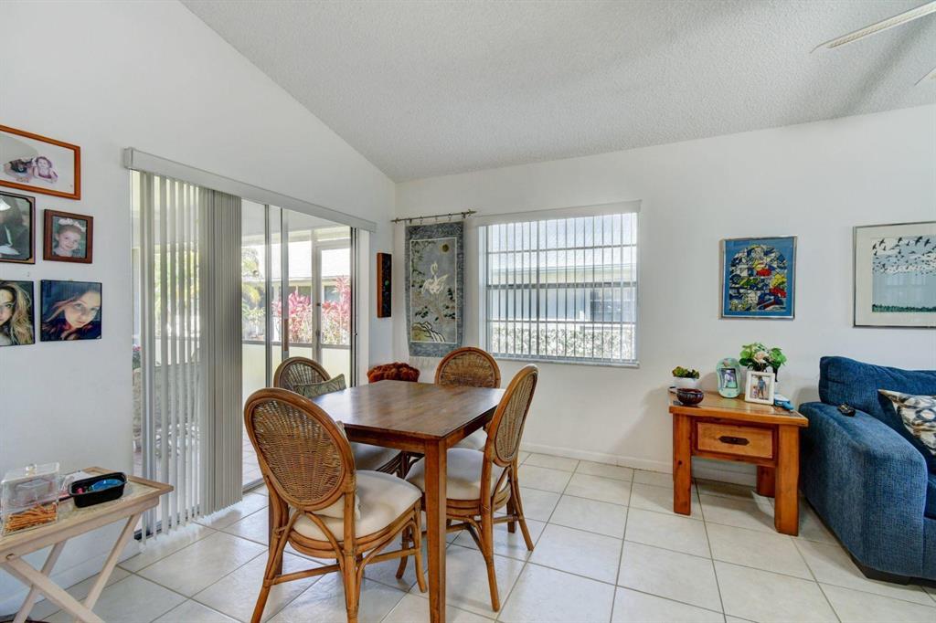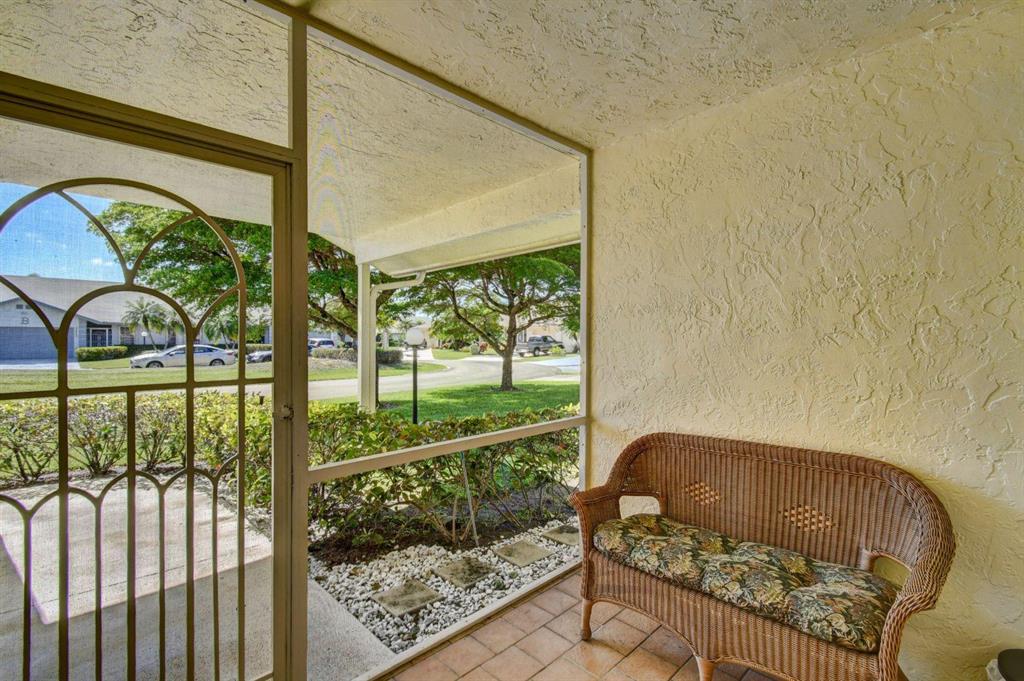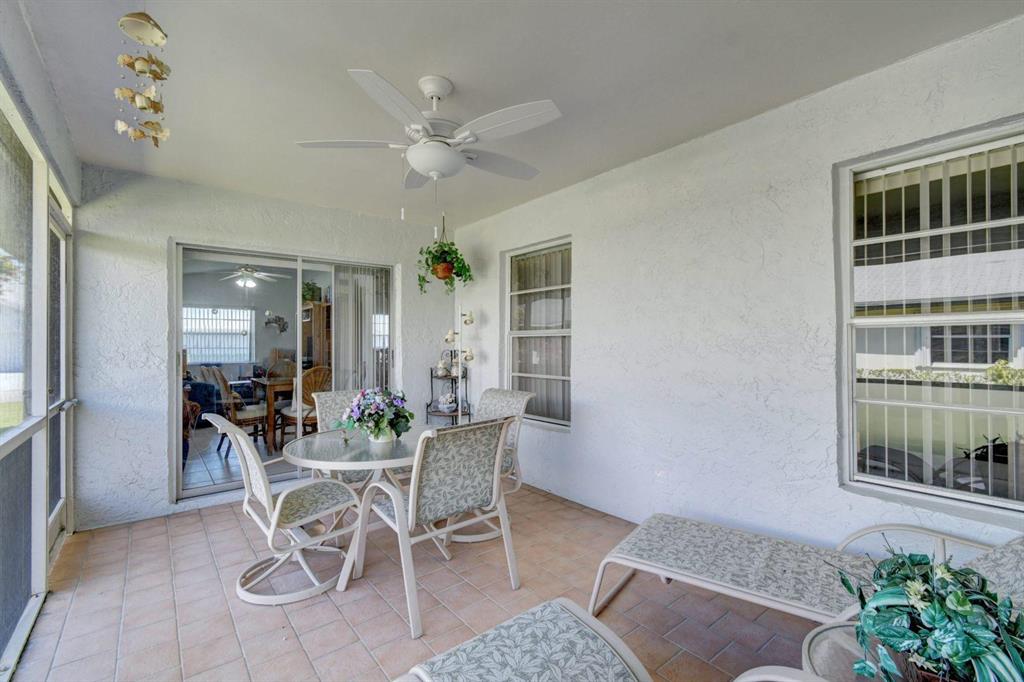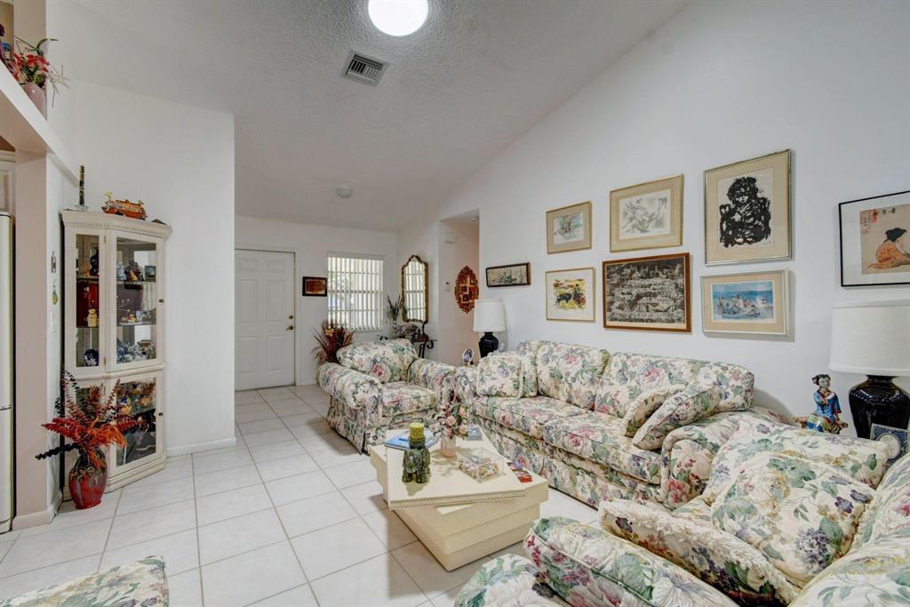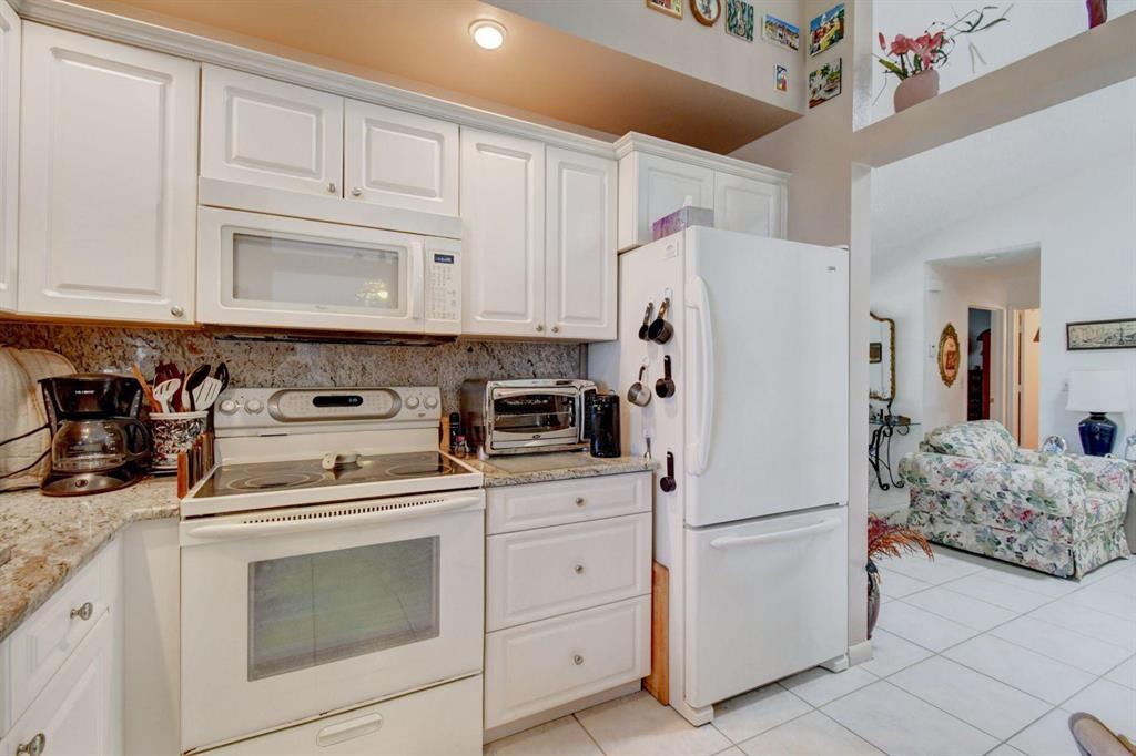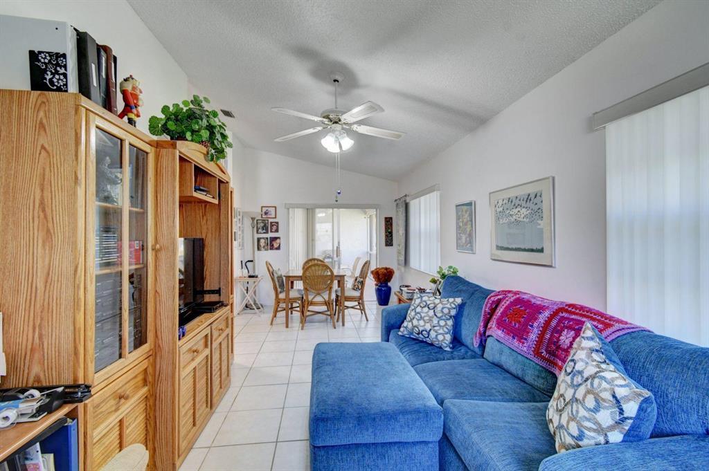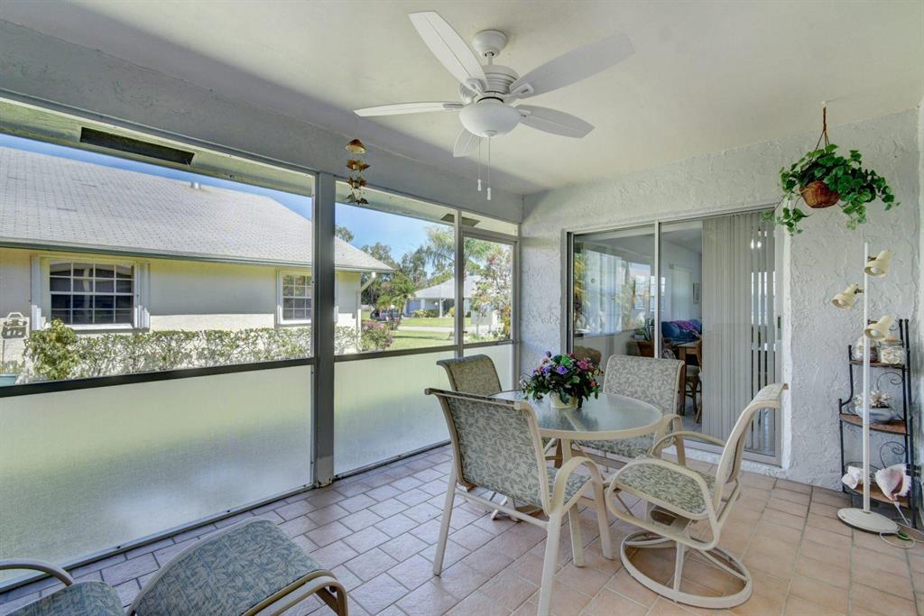 Resort style living attached in sets of 2, in cul de sac, Tiled incls. both patios & all other areas except, carpet 2 BR's. Master bth. upgraded, hi toilets in both baths. kitchen cabs up dated, Granite counter tops, deep & wide sink, accordion shutters, solar & sky lights in living room, 6 fans, A/C system 1 yr., front patio new door & newly re screened, new garage opener. Step down shower in master bath. Community pool heated, gyms, saunas for men& women. Minutes from P.O., grocery, gas & more. I-95, airport, Turnpike 10-15 minutes, beaches 20 min.. Active community w/miniature golf course, shows & more. No golf course fees, TV/internet incl. in fees.