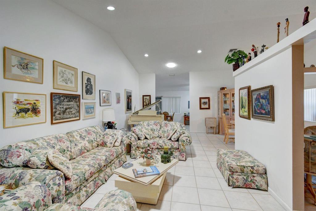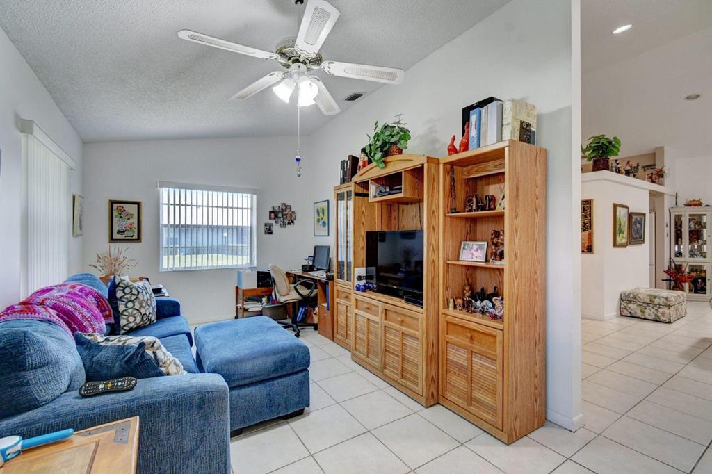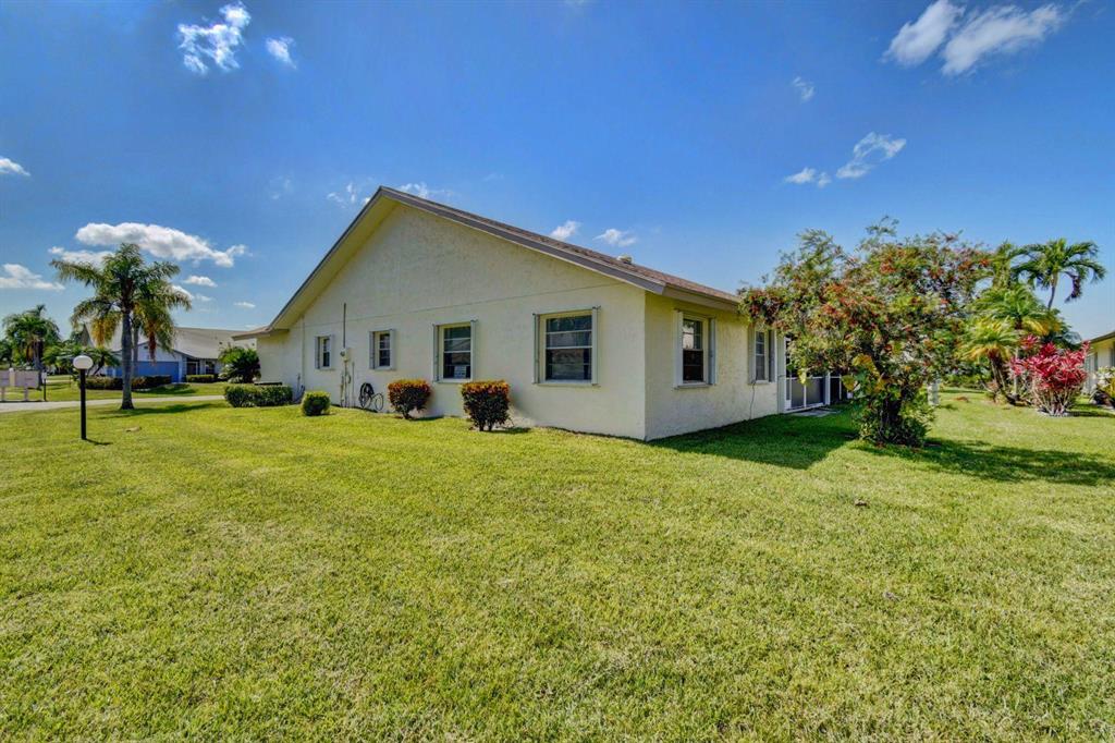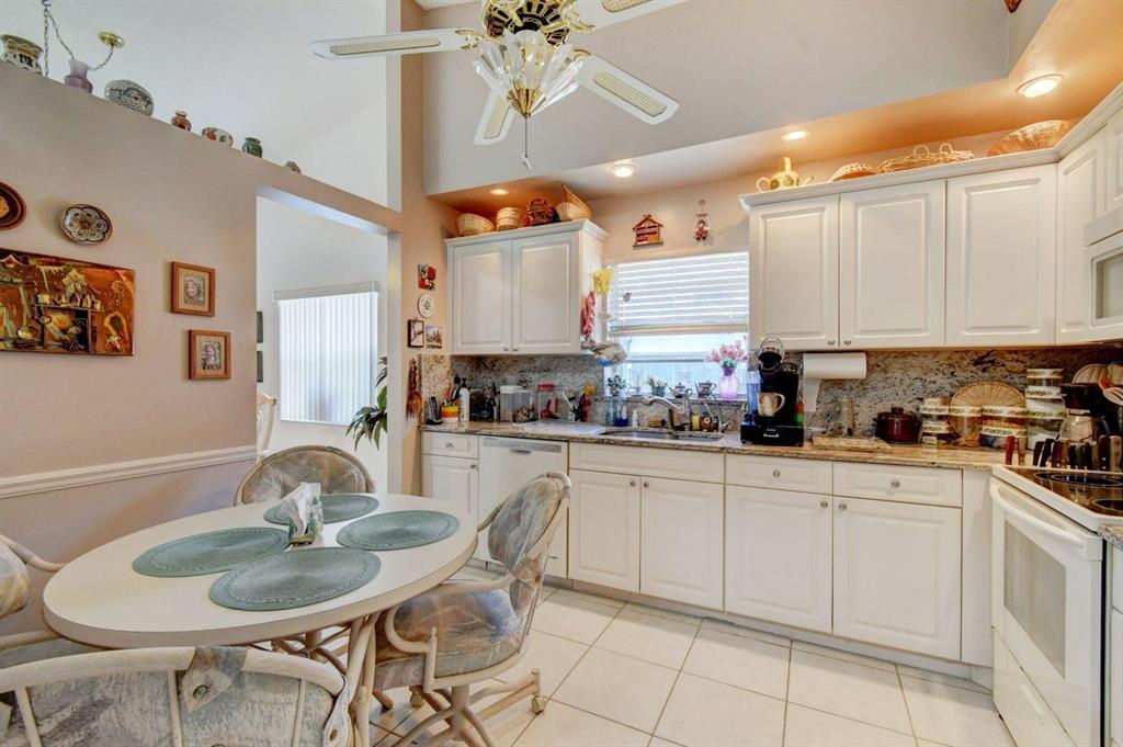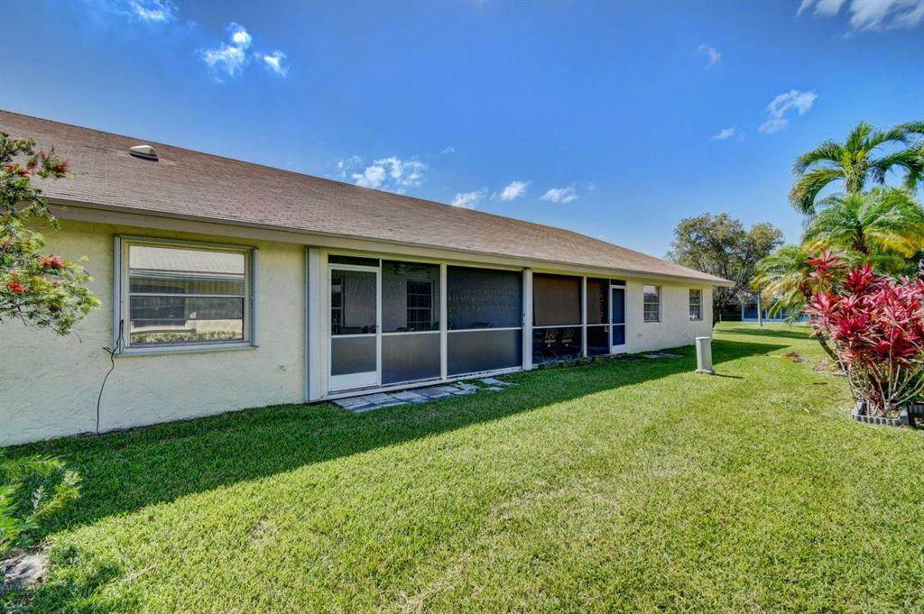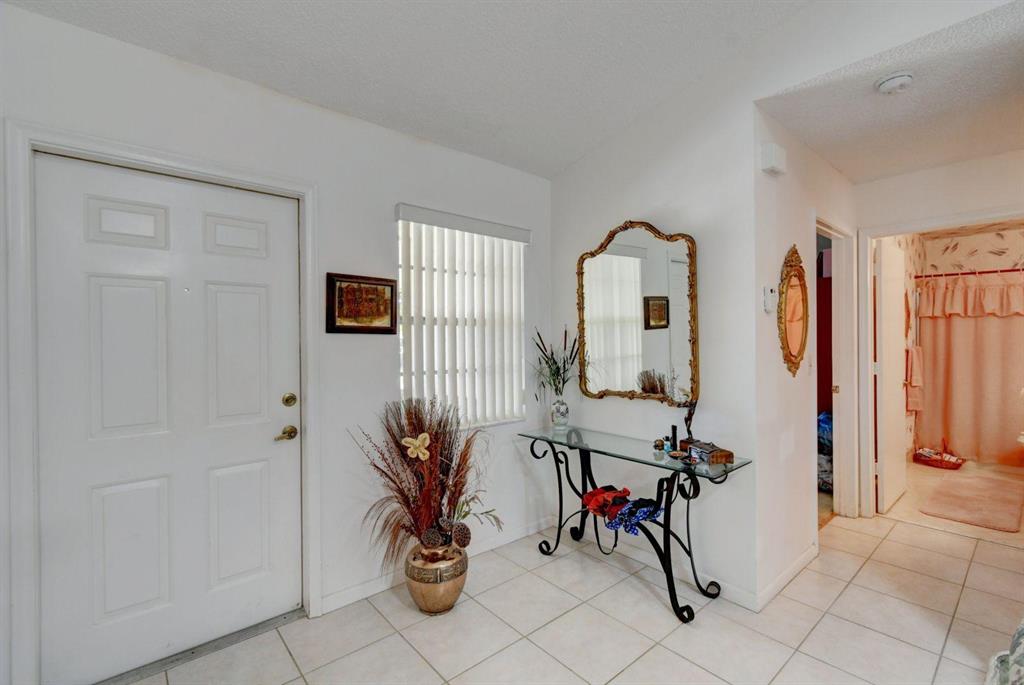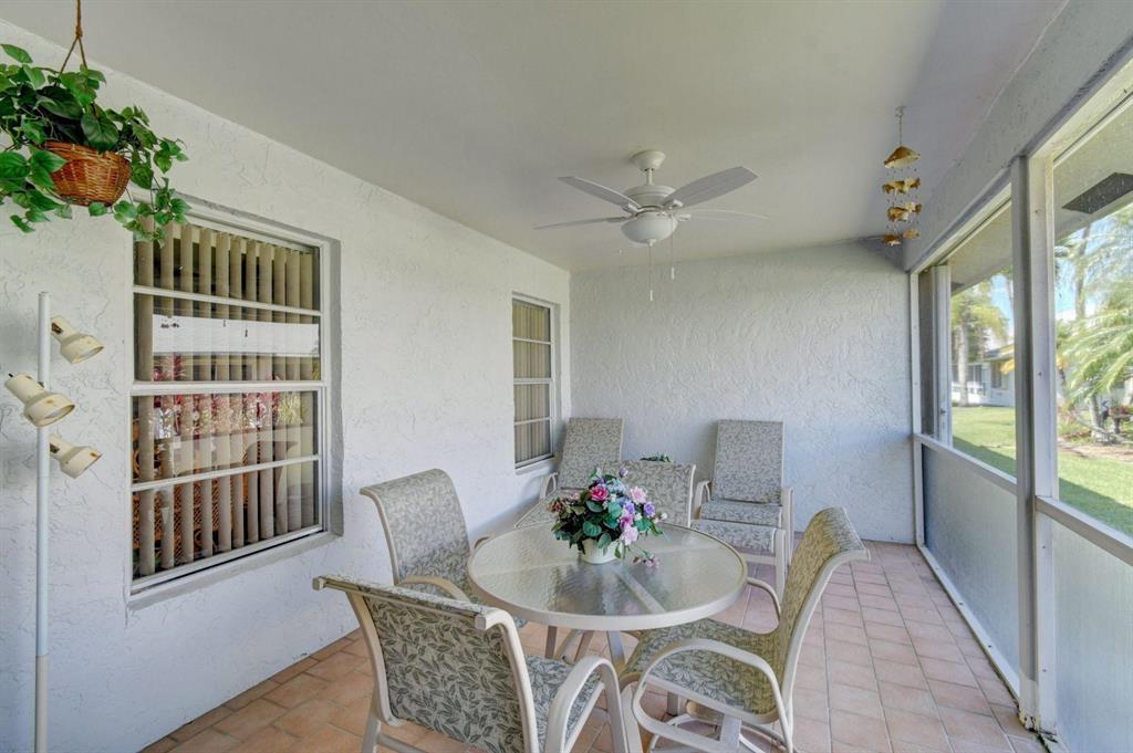 Resort style living attached in sets of 2, in cul de sac, Tiled incls. both patios & all other areas except, carpet 2 BR's. Master bth. upgraded, hi toilets in both baths. kitchen cabs up dated, Granite counter tops, deep & wide sink, accordion shutters, solar & sky lights in living room, 6 fans, A/C system 1 yr., front patio new door & newly re screened, new garage opener. Step down shower in master bath. Community pool heated, gyms, saunas for men& women. Minutes from P.O., grocery, gas & more. I-95, airport, Turnpike 10-15 minutes, beaches 20 min.. Active community w/miniature golf course, shows & more. No golf course fees, TV/internet incl. in fees.