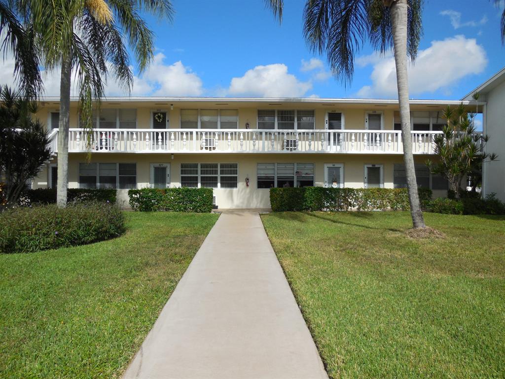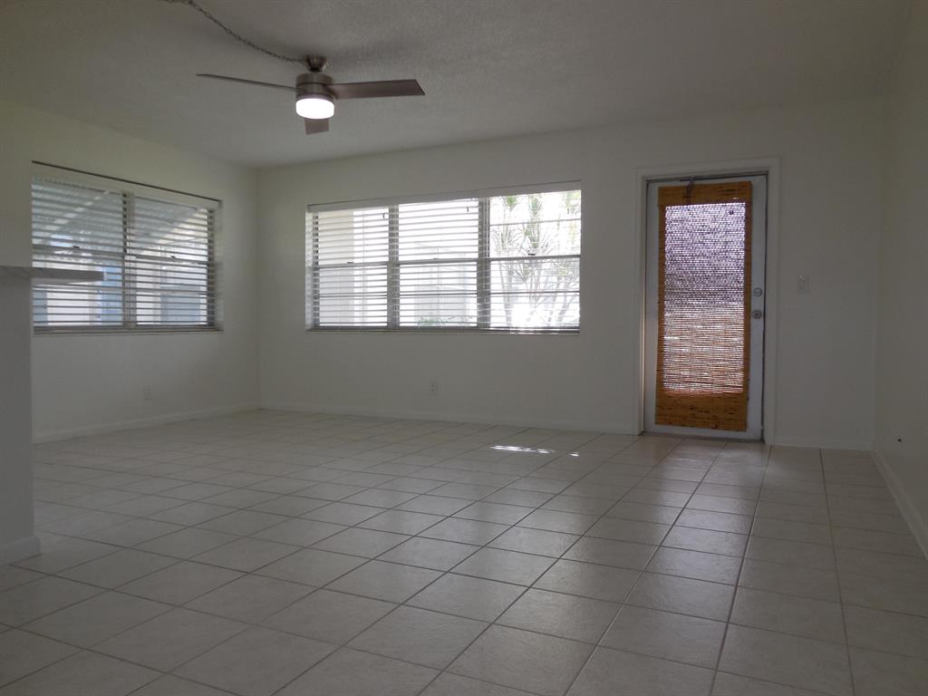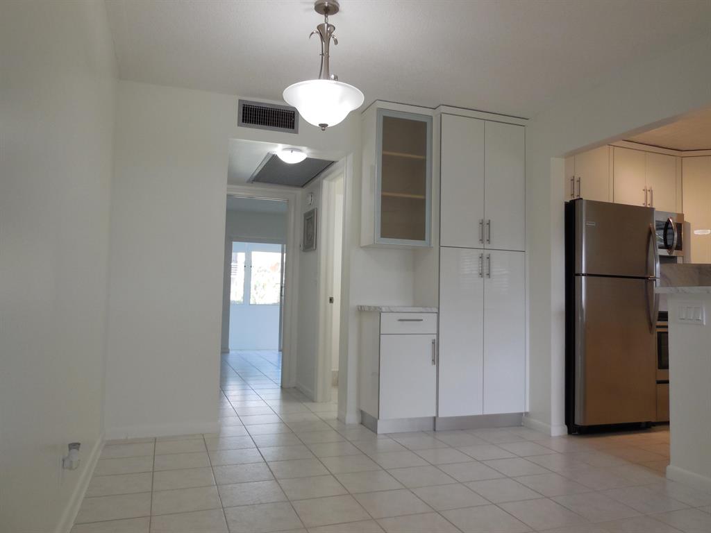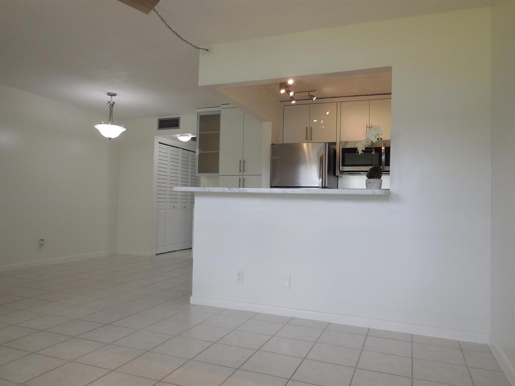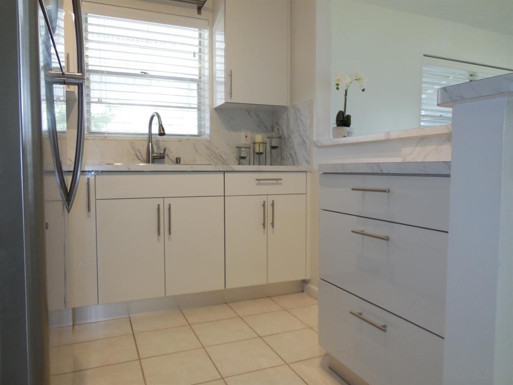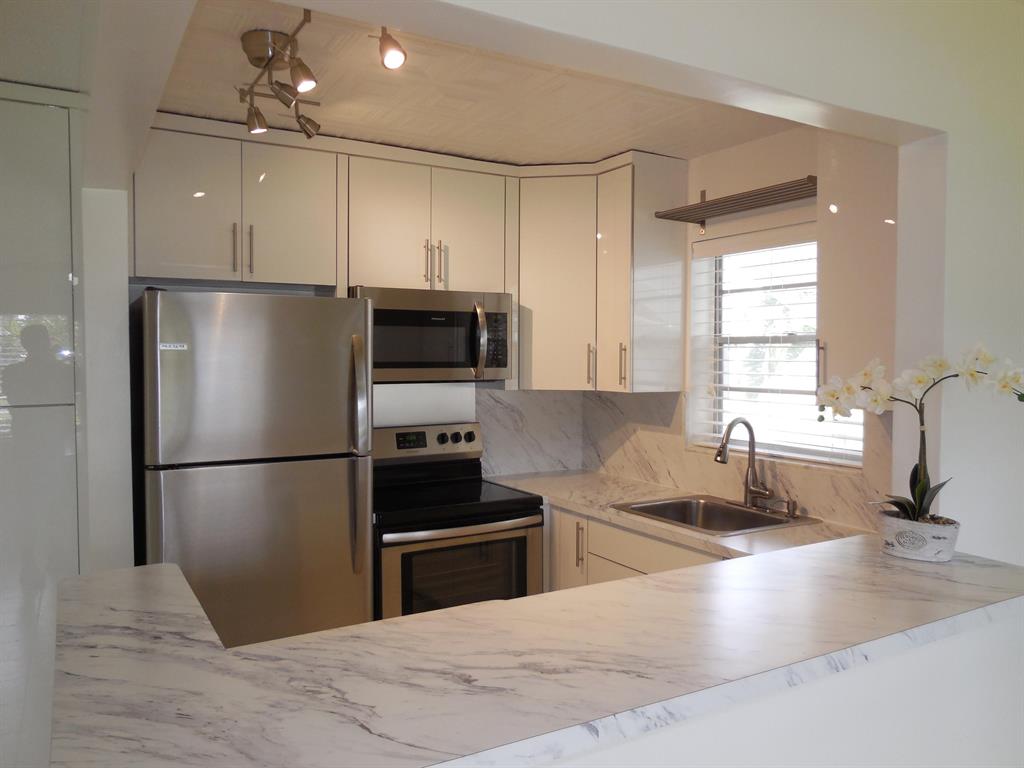 Beautiful recent renovation of this ground floor corner condo located in a 55+ resort-style community. This bright and airy one bedroom, one and one half bath unit is ready for immediate occupancy. Consistent ceramic tile throughout entire condo including enclosed lanai. Open kitchen featuring newer Frigidaire stainless steel appliances, single bowl sink with gooseneck sprayer faucet, marble look countertop and backsplash, soft close drawers and cabinet doors. Living room and bedroom feature remote controlled ceiling fans with light kits. Both bathrooms have vanities that match the kitchen with newer toilets and lighting. Enclosed lanai has sliding vinyl windows covering fully screened expanse offering pleasant garden views. Common laundry room and wonderful outside patio and barbeque area