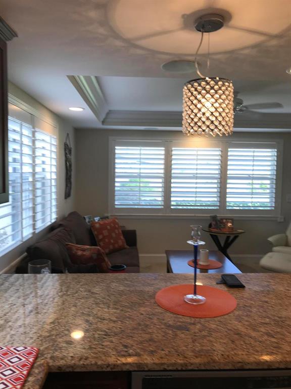 THIS CONDO HAS BEEN COMPLETELY RENOVATED BY A CONTRACTOR. EVERY THING WAS DONE WITH QUALITY WORK MAN SHIP. CONDO FEATURES 7 INCH CROWN MOLDING, RECESSED LIGHTING, VAULTED CEILINGS, GRANITE COUNTER TOPS, CABINETS OF HIGH QUALITY WITH TWO LAZY SUSAN FOR EXTRA STORAGE, WITH OTHERS BUILT INS FOR MORE STORAGE THRU OUT THE CONDO. CERAMIC TILE THRU OUT, CHEF'S KITCHEN WITH PLENTY OF COUNTER SPACE FOR ENTERTAINING, SURREAL SOUND IN LIVING ROOM AND DIFFERENT SET UP SOUND IN BEDROOM. POCKET DOORS, PLANTATION SHUTTERS, HURRICANE IMPACT WINDOWS ON PATIO ENCLOSED WHICH LEADS TO SIDEWALK TO PARKING. TANK LESS WATER HEATER, FULLY FURNISHED AND STOCK WITH DISHES, LINEN, ETC. CLOSE TO POOLS, TURN KEY MODEL, OWNER HAS GREAT TASTE IN FURNISHINGS AND WILL LEAVE EVERY THING EXCEPT A COUPLE OF PAINTINGS.