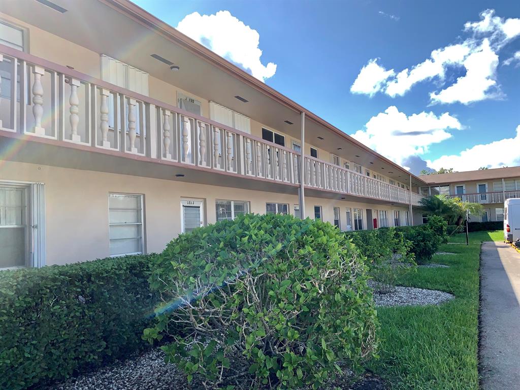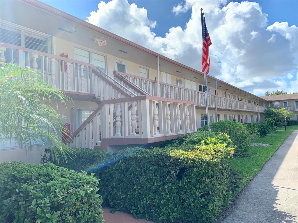 Charming 1 bedroom 1 1/2 bathroom condo with spectacular water views! Private second floor unit with large screened balcony. Wood flooring thru-out the living areas. Large dining area just off the kitchen. The floorplan features a 1/2 bathroom for your guests. Spacious 1 bedroom with lots of closet space. Accordion hurricane shutters. Located in Century Village - beautiful gated community with fantastic amenities including community pools, clubhouse and fitness center. This is a rentable building in Century Village - HOA requires a 2 year waiting period before a new owner can use as a rental.