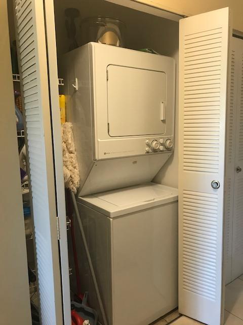 This 2nd floor 2/2 unit has a updated kitchen, 2018 AC, full size stacked washer dryer and comes partially furnished. Screened and enclosed porch with lovely views of the waterway. This street has its own satellite pool but just around the corner from the clubhouse and larger pool and gym. Tons of activities, transportation, and close to highways and shopping. 55+ community .