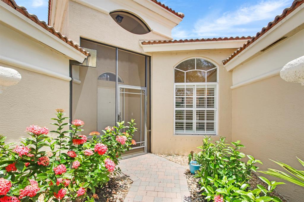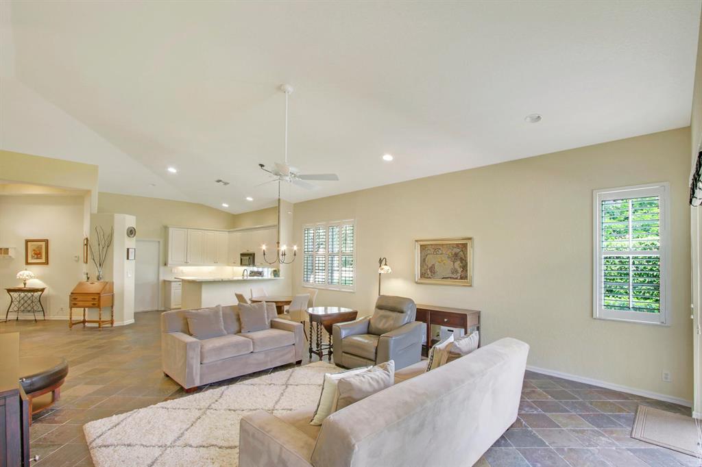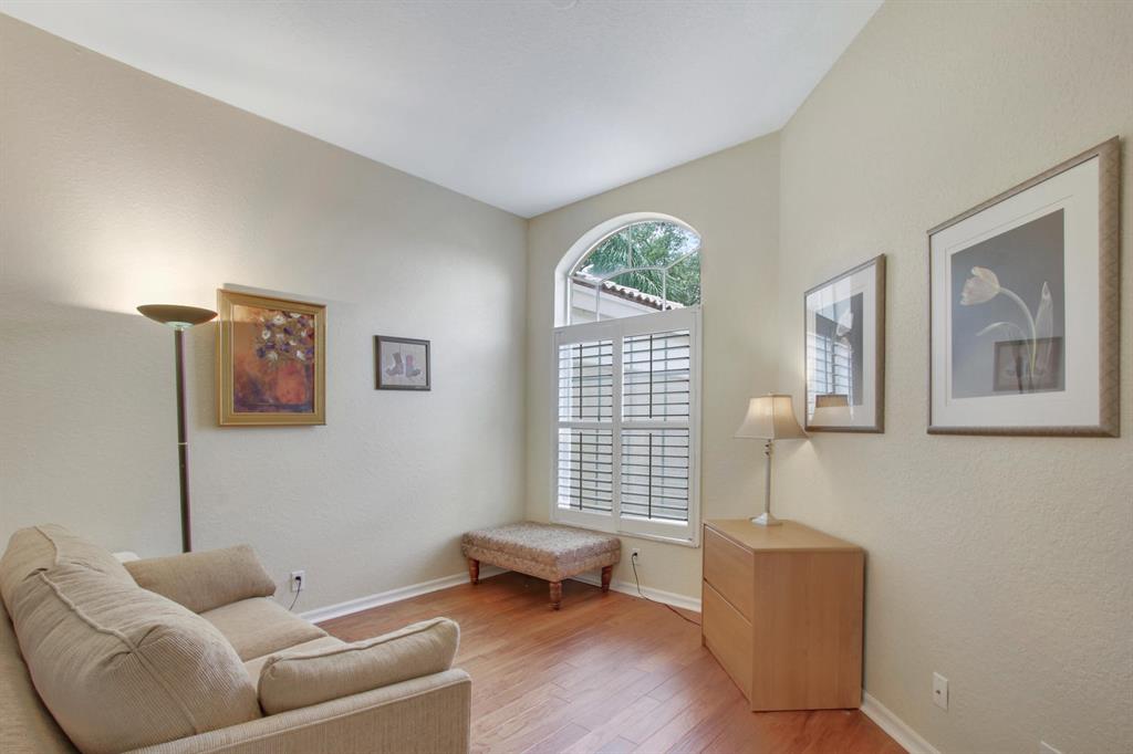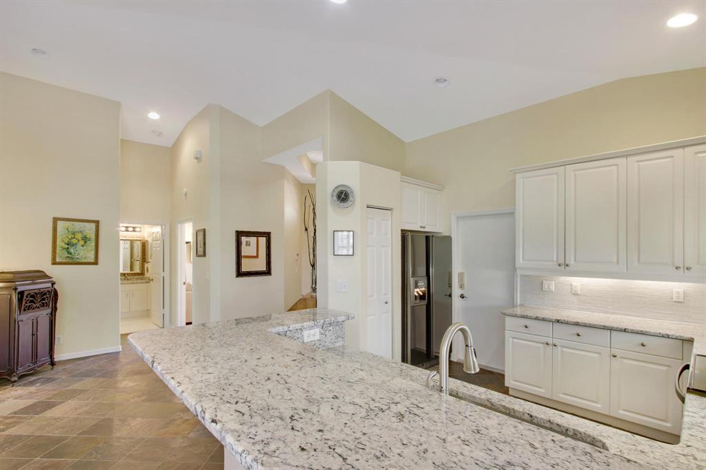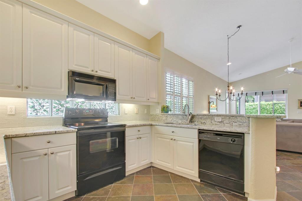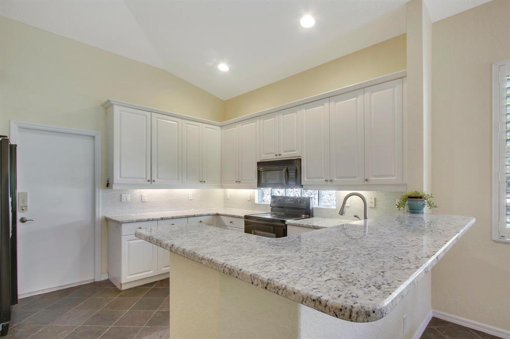 Perfection! Single-story, sunny, spacious, corner 2 Bed+DEN Villa. Open floor plan, diagonal slate floors, high ceilings, plantation shutters, custom blinds, dual glass sliders to private screened-in patio. Gleaming white kitchen boasts tall cabinets with lower pull-outs, pantry, custom glass backsplash, granite counters w/bar seating. Master bedroom has tray ceiling, engineered wood floors, and his & hers walk-in closets with custom organizers. Master bath features dual vanities, soaking tub and separate shower. Den (possible 3rd bedroom) with beautiful French doors and sliders to enclosed patio. 2nd full bath has granite counter and tub/shower combo. Ceiling fans throughout; newer AC. Laundry room w/tall wrap-around cabinetry for extra storage. 2-car garage w/extended driveway.