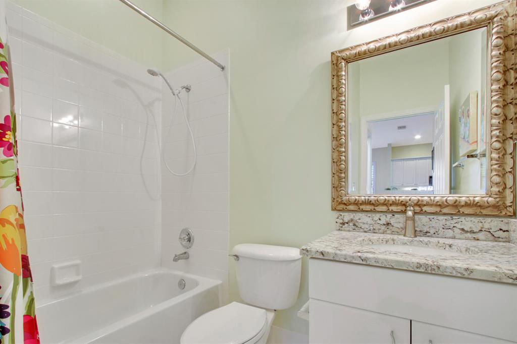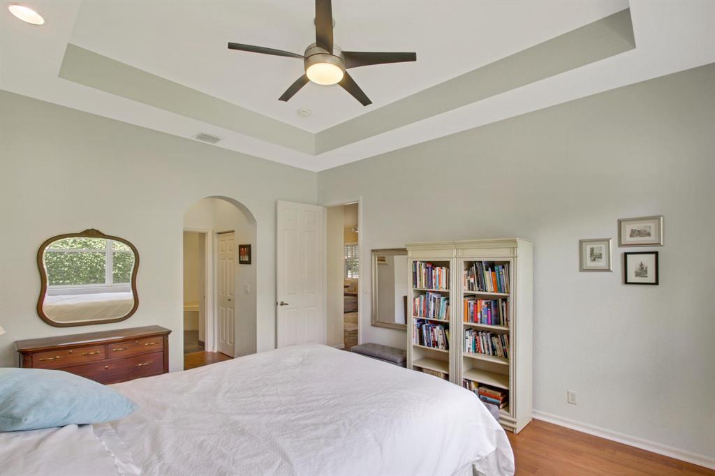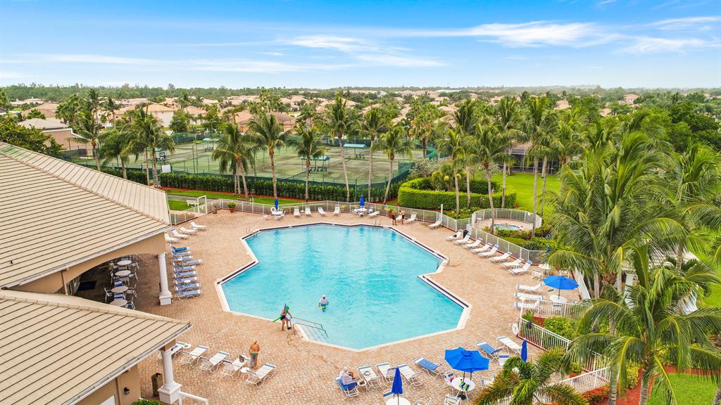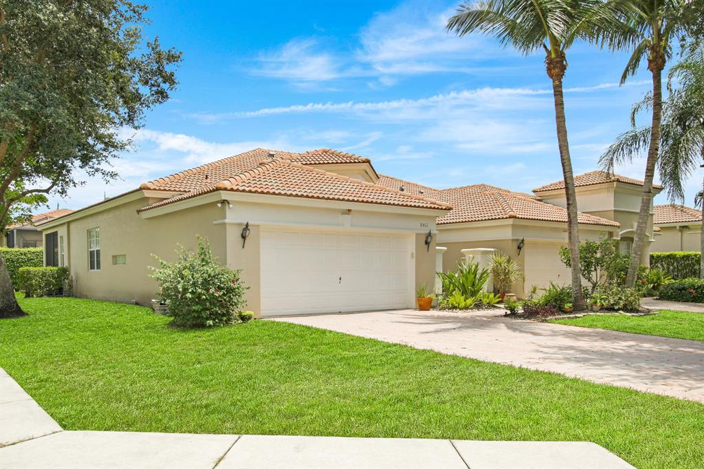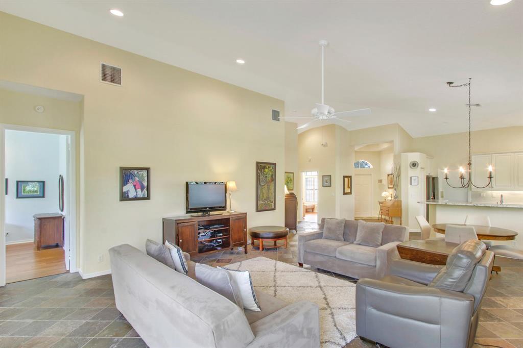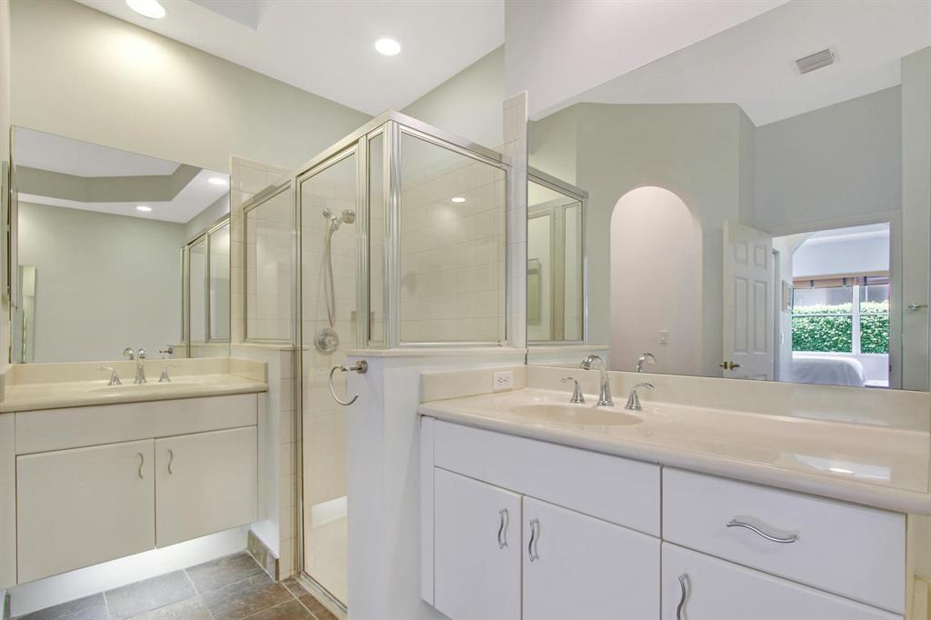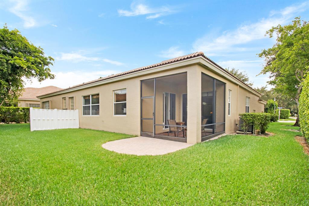 Perfection! Single-story, sunny, spacious, corner 2 Bed+DEN Villa. Open floor plan, diagonal slate floors, high ceilings, plantation shutters, custom blinds, dual glass sliders to private screened-in patio. Gleaming white kitchen boasts tall cabinets with lower pull-outs, pantry, custom glass backsplash, granite counters w/bar seating. Master bedroom has tray ceiling, engineered wood floors, and his & hers walk-in closets with custom organizers. Master bath features dual vanities, soaking tub and separate shower. Den (possible 3rd bedroom) with beautiful French doors and sliders to enclosed patio. 2nd full bath has granite counter and tub/shower combo. Ceiling fans throughout; newer AC. Laundry room w/tall wrap-around cabinetry for extra storage. 2-car garage w/extended driveway.