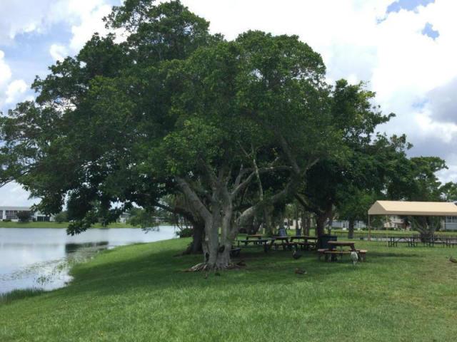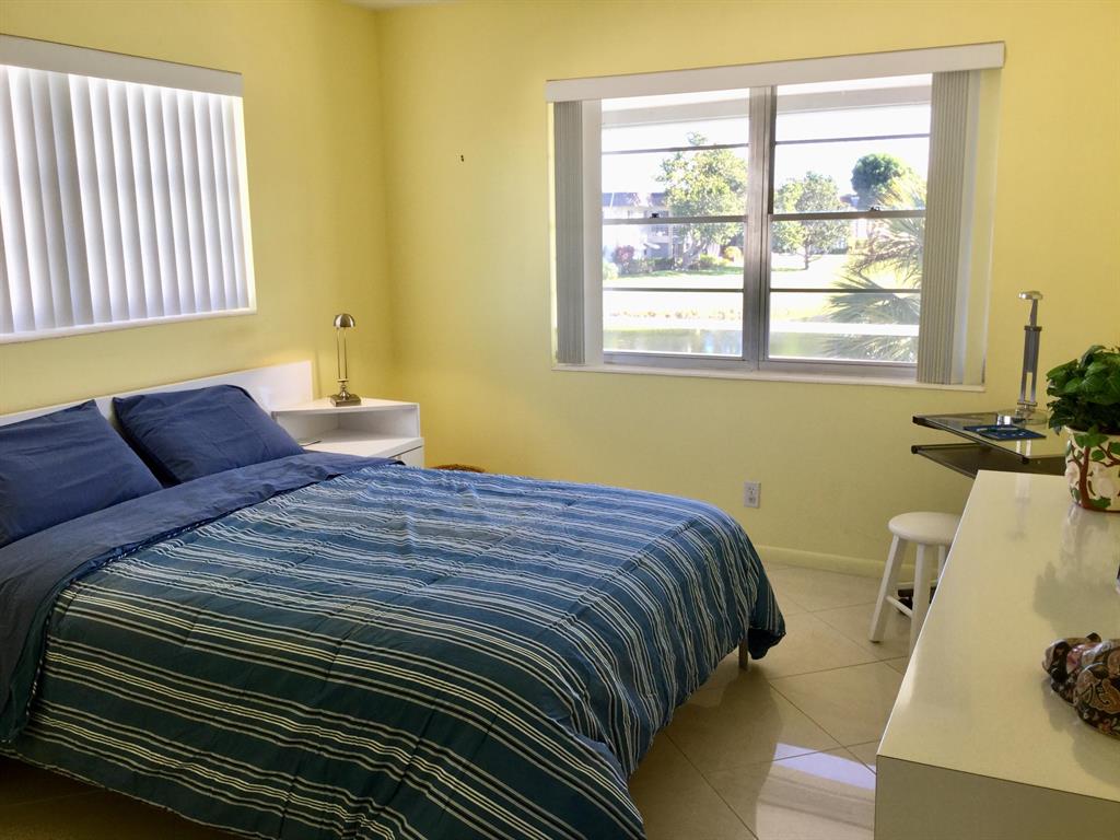 This Absolutely Beautiful furnished updated 2 bedroom 1 & 1/2 bath corner unit condo is located in Century Village a 55+ gated community. This loved and well maintained condo is tastefully furnished and has tile floors throughout. The bedrooms and patio have fabulous lake and island views. This condo is located on the second floor near the stairs and the building also has an elevator. The kitchen has white cabinets and appliances with blue counter tops and tiled back splash. The full bath has a bathtub/shower combo with a custom sliding glass door enclosure. Century Village as many wonderful activities and amenities for active residents to enjoy such as a Fitness center, Clubhouse with theater, heated indoor pool/spa and sauna, shuffleboard, community free shuttle service etc.