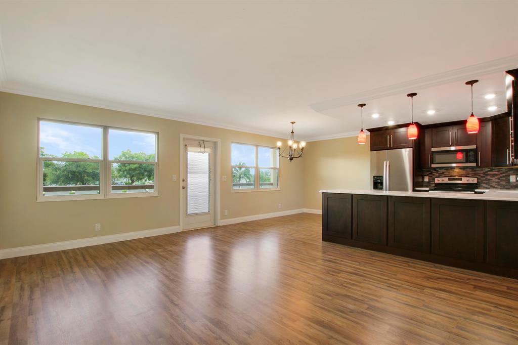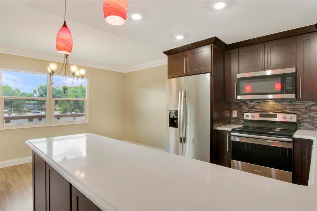New! New! New! Completely renovated unit with no work required. Beautiful open kitchen with solid wood quiet close cabinets, quartz countertops, new stainless appliances & glass backsplash. The electric has been updated with new panel, wiring, LED high hats and light fixtures. New laminate flooring & double thick baseboards & molding carry throughout. Both bathrooms have been remodeled from the vanities to the tile work in the showers to the plumbing. AC unit is new and all of the duct work has been professionally cleaned. French doors lead you out to the sun room from both bedrooms. Impact windows line the entrance of the condo. Permits were pulled for everything! No poor craftsmanship here. Century Village offers ample amenities including 24 security, clubhouse, pool, shuttle bus & more!