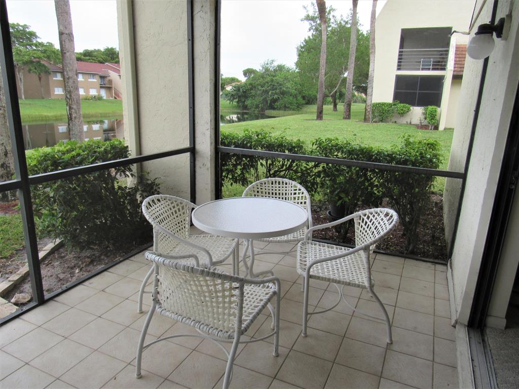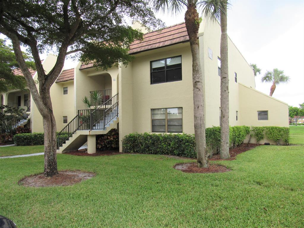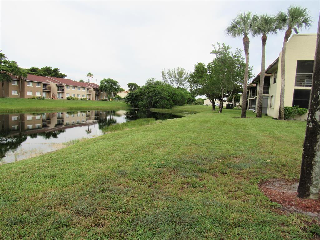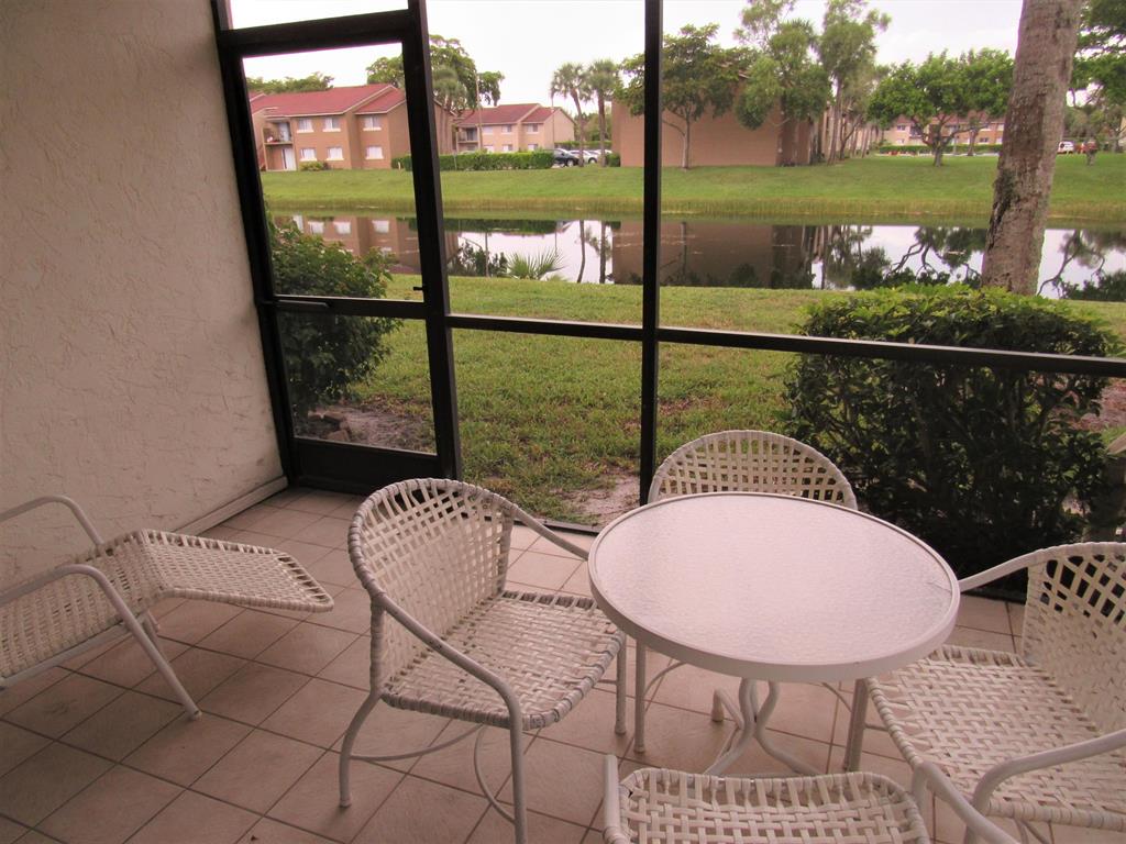 Large 1st floor corner 2 Bedroom/2 Bath Condo. Large eat in kitchen and a formal dining area. Master Bedroom has two closets, one a walk in. Large 2nd bedroom and bath. Nice waterview from the screened in patio. Full size washer/dryer in unit. Newer water heater and range. Your updates will make this the perfect home. This unit was only used a few months a year by snowbird owners. Being sold furnished and fully equipped. Very close to the satellite pool. One dog up to 30lbs. allowed in this phase of Golden Lakes. Come enjoy your active 55+ lifestlye with tons of activities. Pools, Jacuzzis, Card/Game Rooms, Billiards, Tennis, Shuffleboard, Gym and much more. Property Management and Social Director on site. Close to shopping, restaurants and Florida turnpike. Just minutes to PBIA.