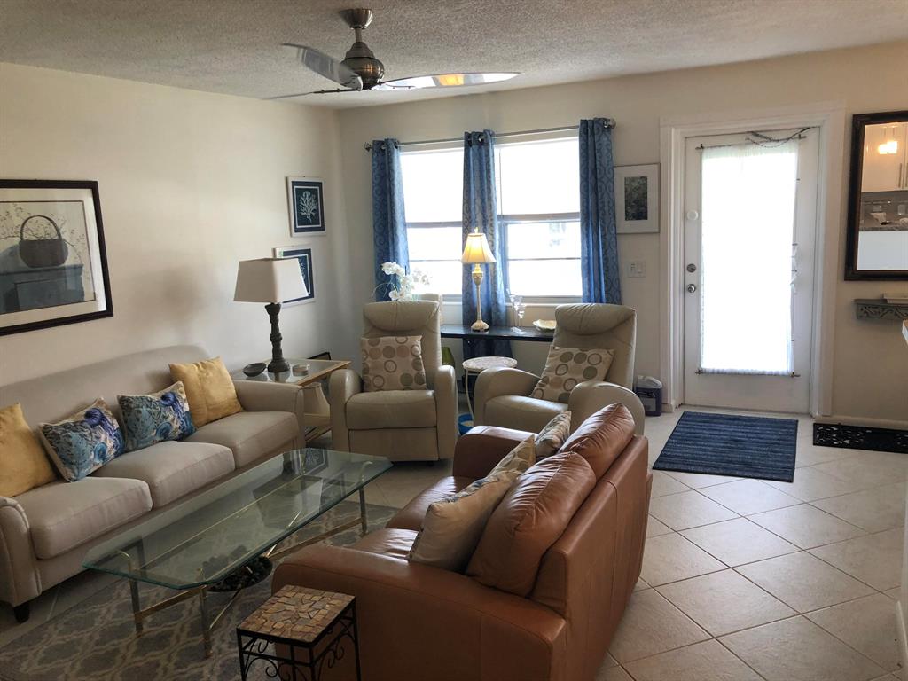 Beautifully updated & fully furnished 2 bedroom, 1-1/2 bathroom unit on 2nd floor of beautifully kept building in 55+ community. Beautiful Ceramic Tiles throughout with updated open kitchen with Stainless Steel Appliances. Updated Bathrooms. Move in condition. Walking distance to the pool. Near shopping, Palm Beach Outlets, Beaches, Airport and restaurants.