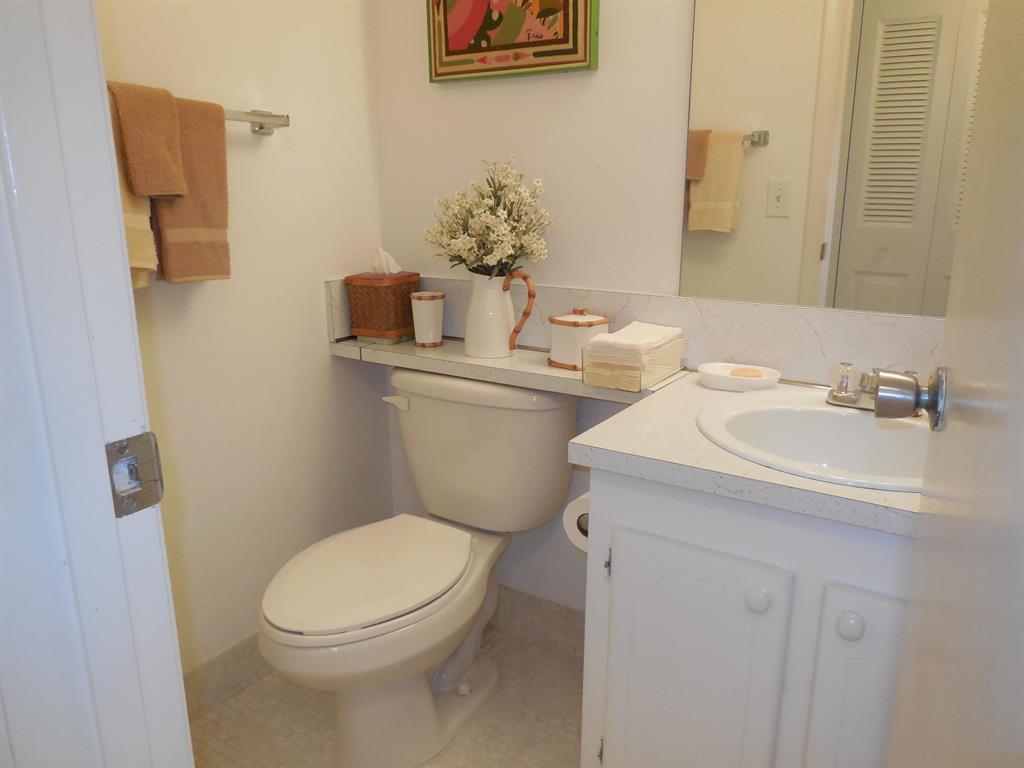 Very desirable ground floor outside corner unit. Living room has sleeper sofa for additional guest space. Fantastic open kitchen concept with full kitchen appliances. Ceiling fan and additional trac-lighting brighten kitchen work areas. Ceramic tile throughout except in bedroom with comfortable thick-pile carpet. Close to Camden Pool and Okeechobee entrance. Some items do not convey and are identified in pictures.