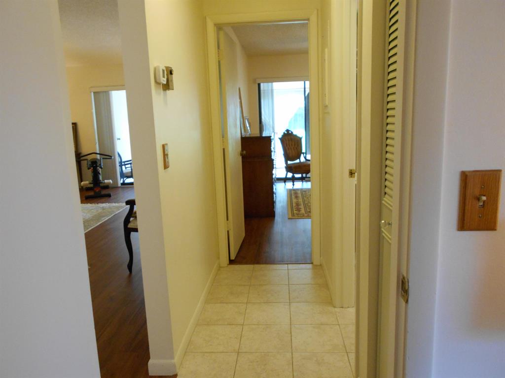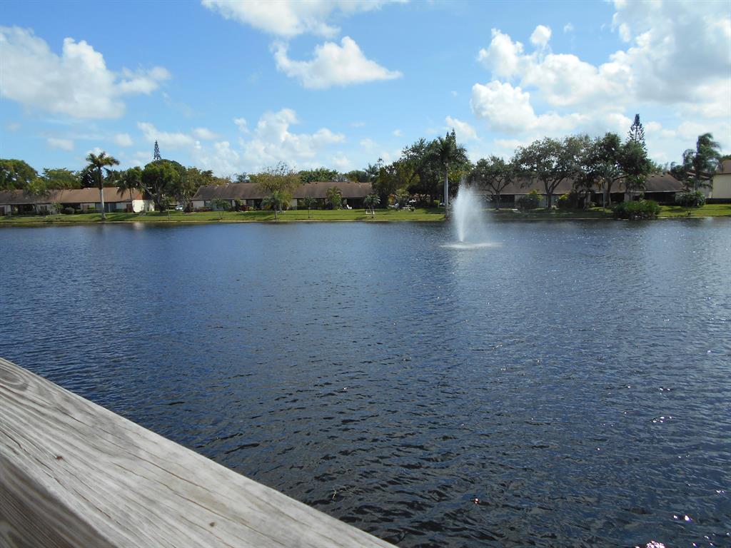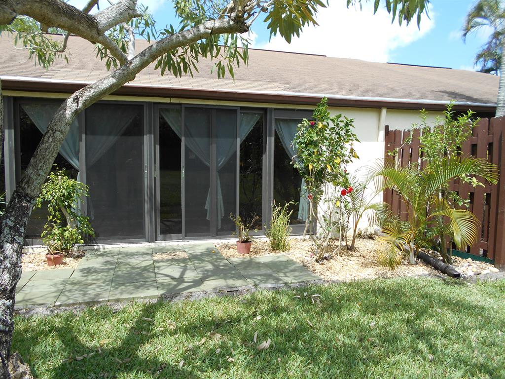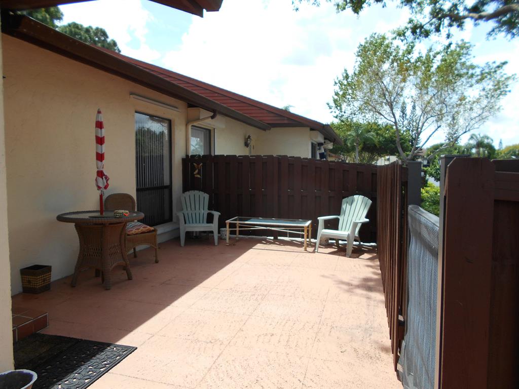Much sought after VILLA; 1 fl., patio to the no. side and 18x10 porch on the back facing what looks like a preserve, deep w/ green area w/trees . Fees incl. upcoming re roof, and new fencing.impact windows @ back patio sliders, gated entry system. Hallway separates the 2 Bedrooms. Close to shopping, PBIA air port, I-95 & Turnpike. Beaches 15-20 min.