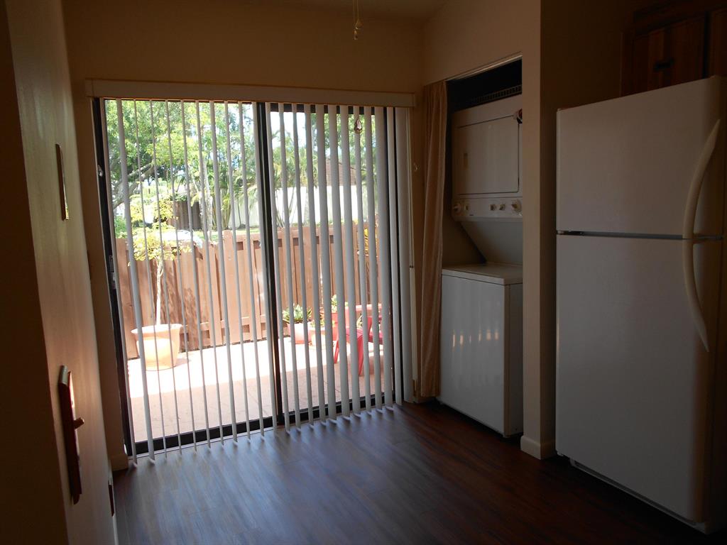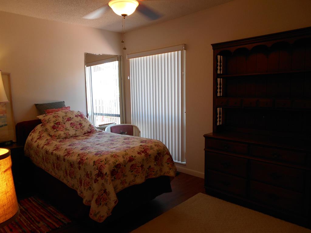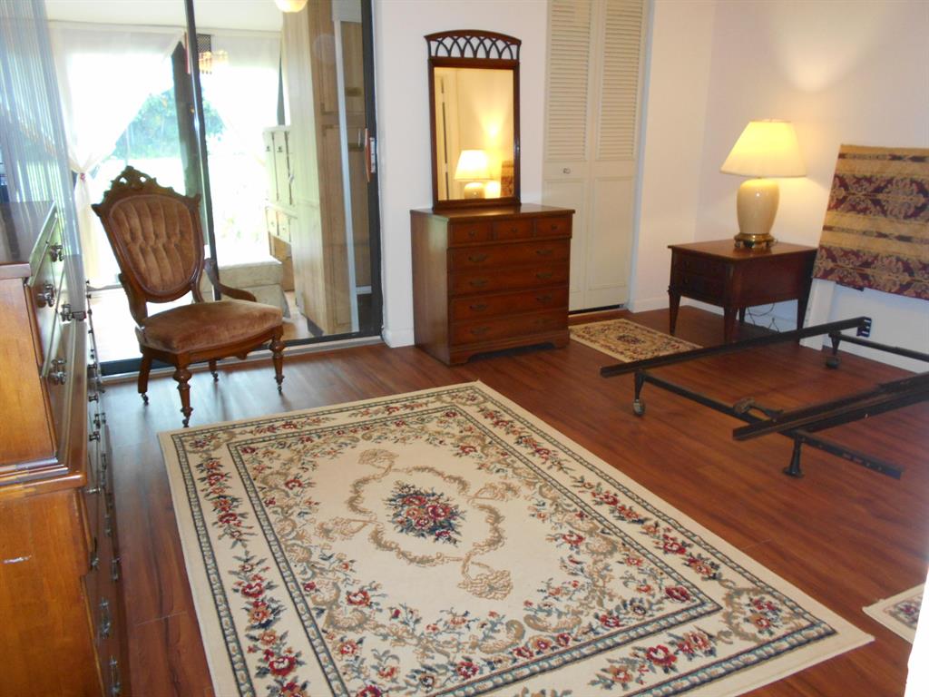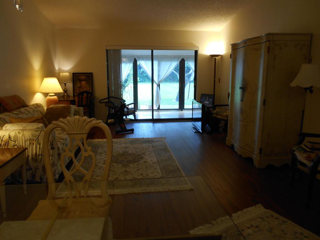 Much sought after VILLA; 1 fl., patio to the no. side and 18x10 porch on the back facing what looks like a preserve, deep w/ green area w/trees . Fees incl. upcoming re roof, and new fencing.impact windows @ back patio sliders, gated entry system. Hallway separates the 2 Bedrooms. Close to shopping, PBIA air port, I-95 & Turnpike. Beaches 15-20 min.