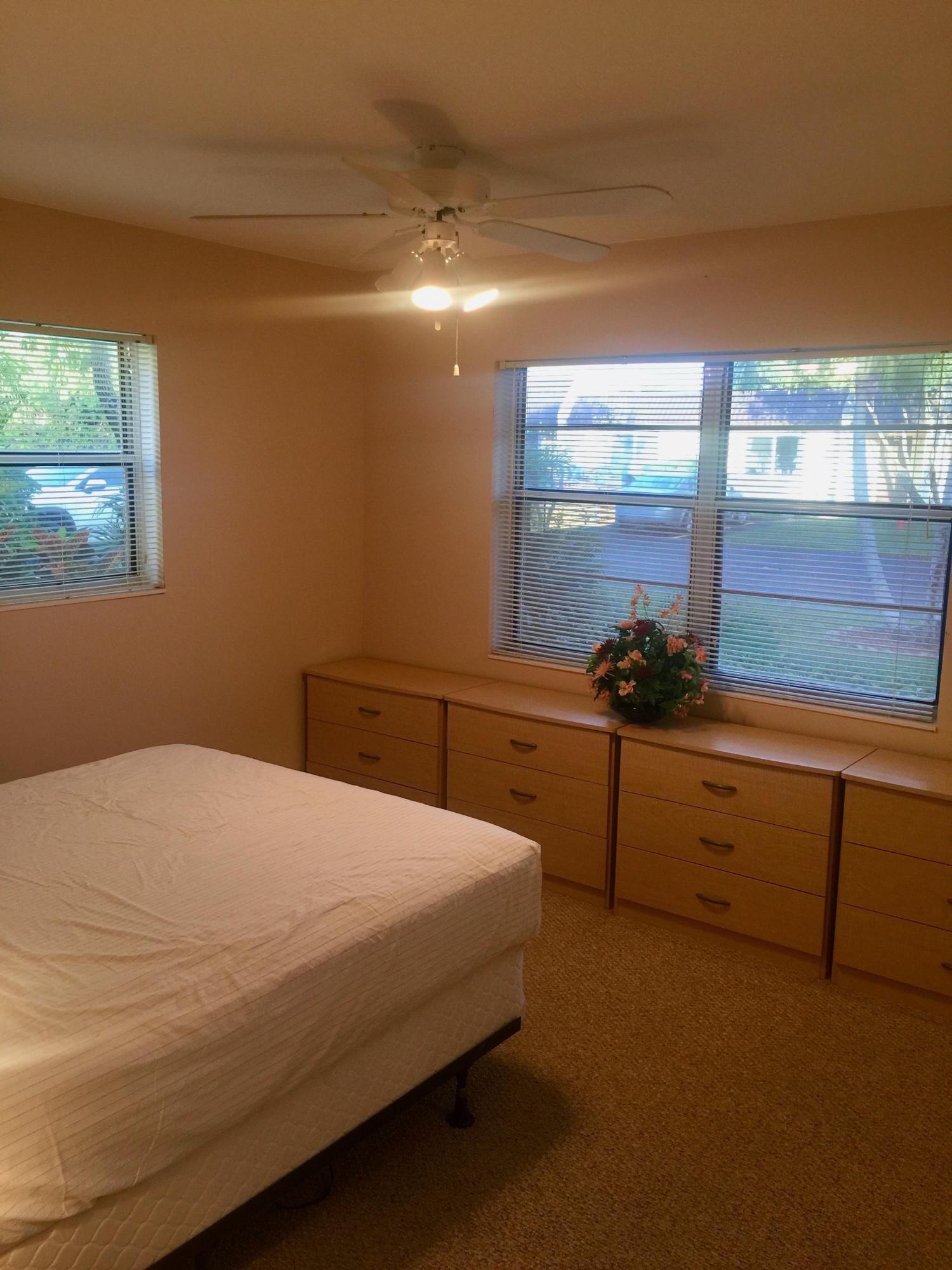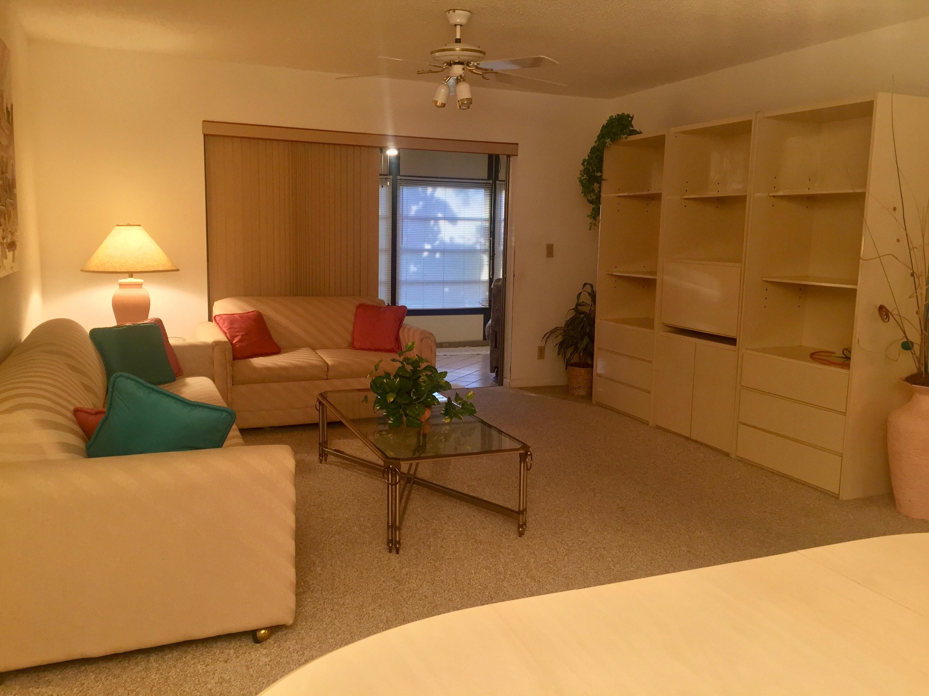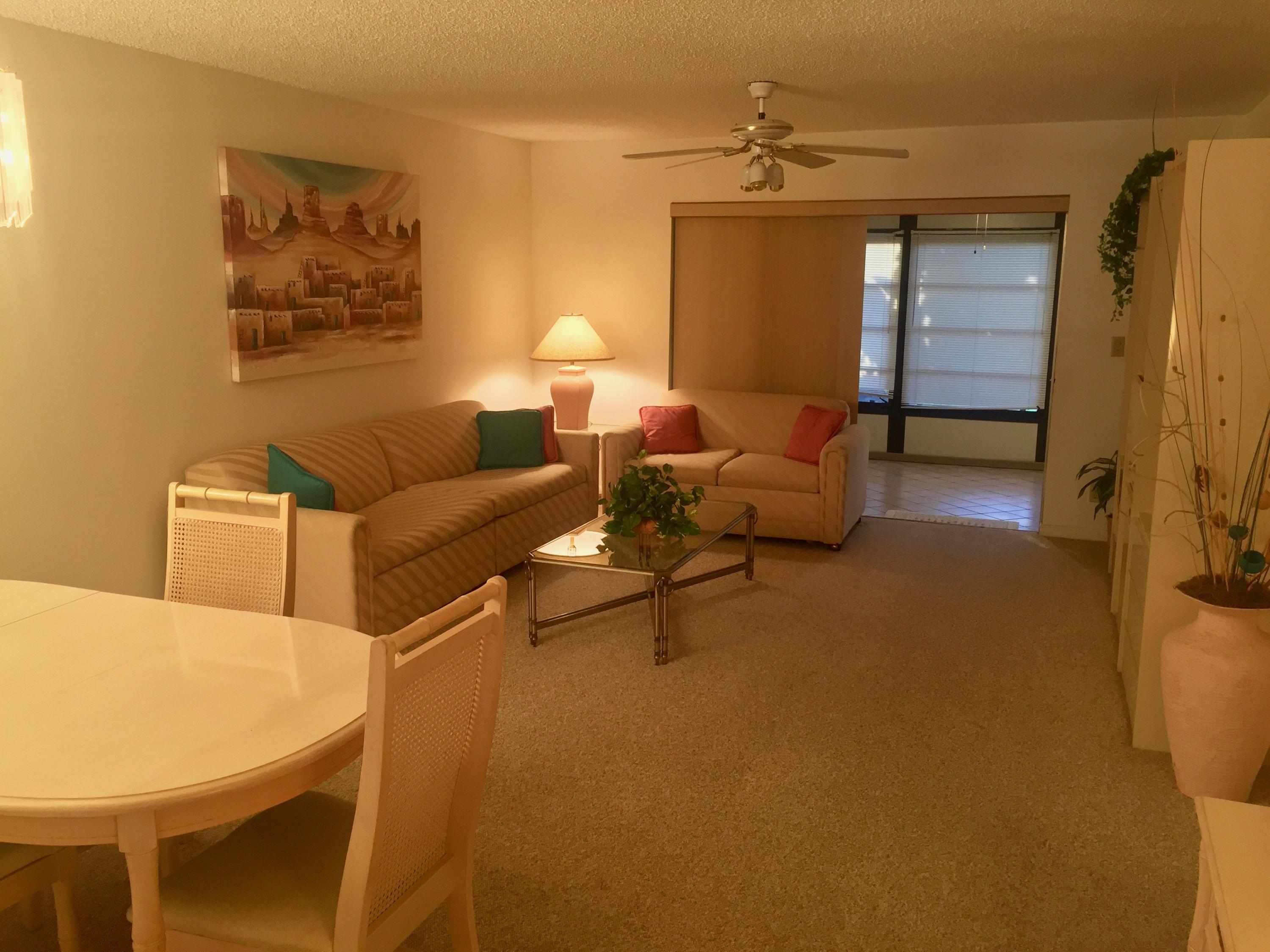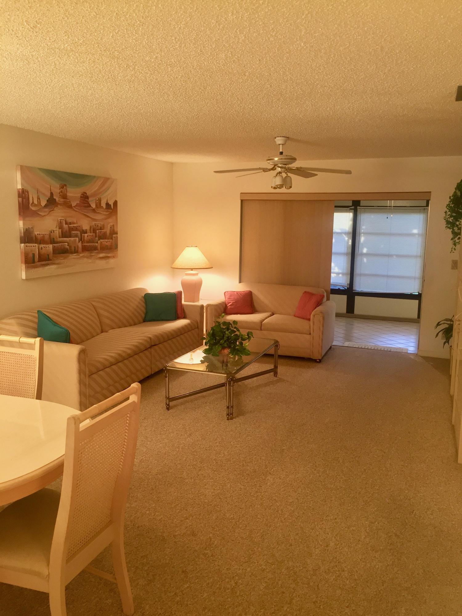Spacious 2BR, 2BA Villa with great water views form the enclosed air-conditioned patio. Desirable end unit with eat in kitchen that opens to living area and full-size washer/dryer. Located on a quiet street with very little traffic on the southwest corner of the community. Active adult community with 2 pools, fitness center with sauna, hot tub, game room, shuffleboard, tennis courts and a putting green. Community offers a courtesy bus with planned activities and a cafe for breakfast and lunch. Only minutes away from the airport, downtown West Palm, City Place, the Kravis Center for Performing Arts, and local beaches.