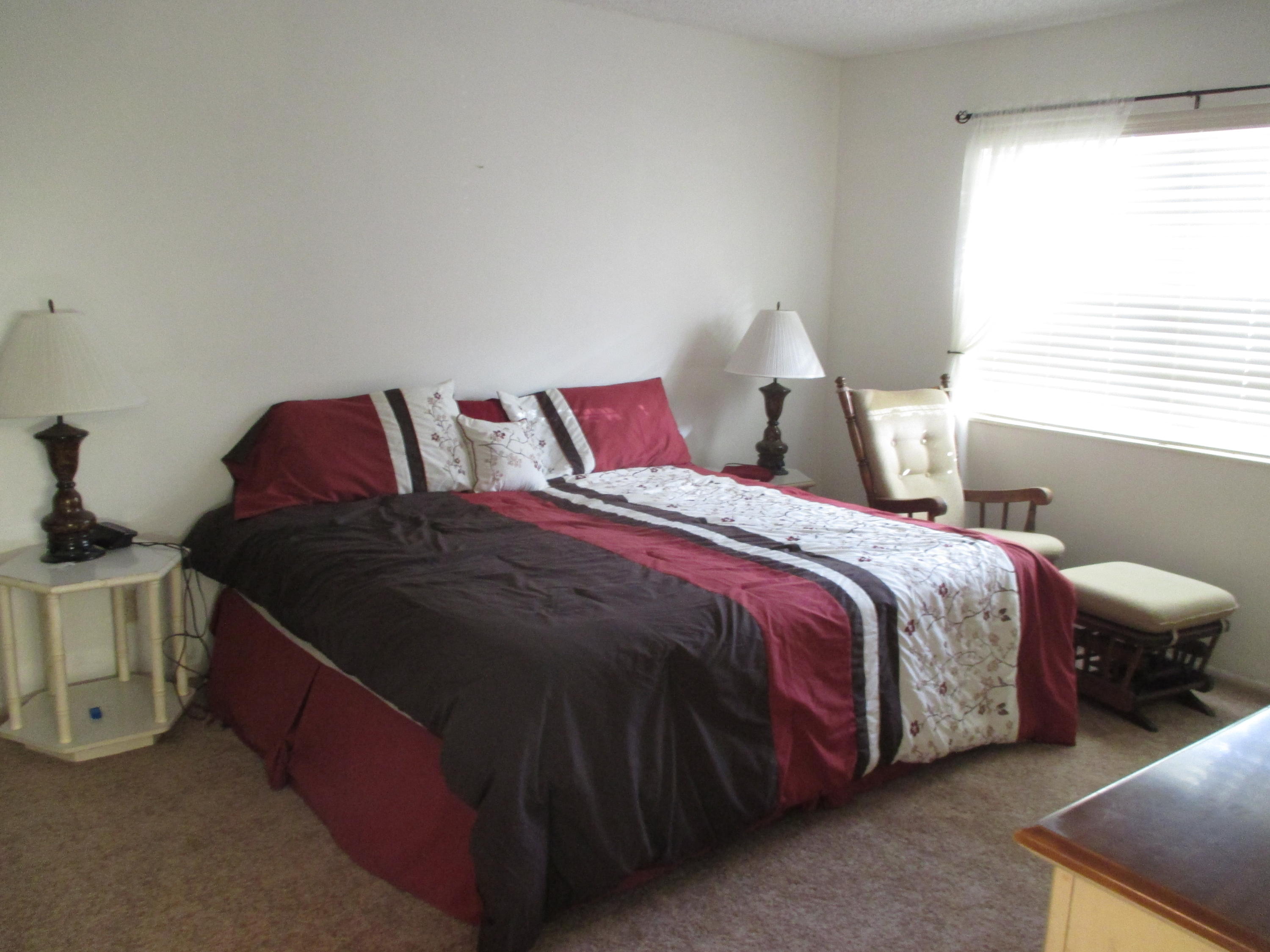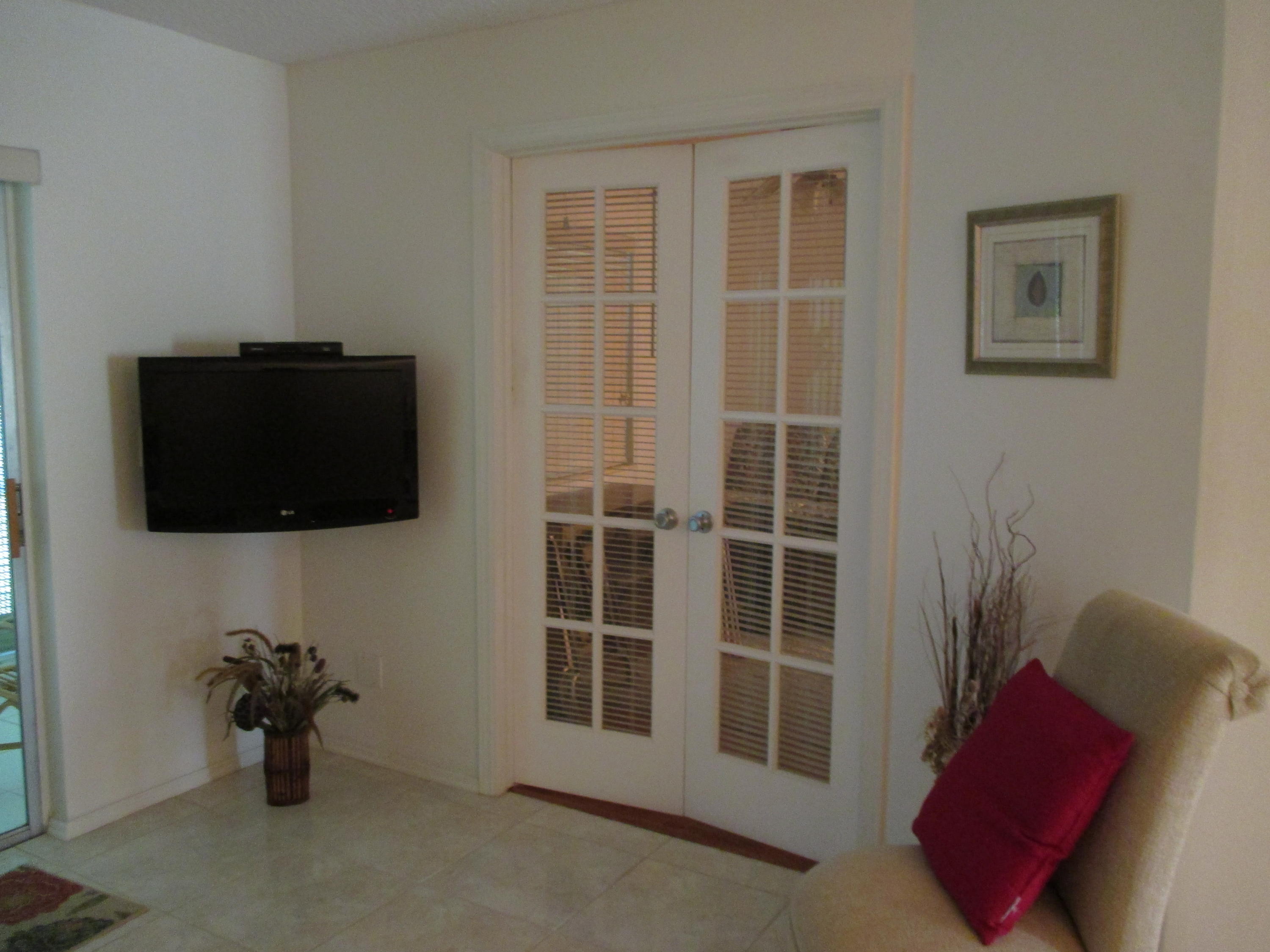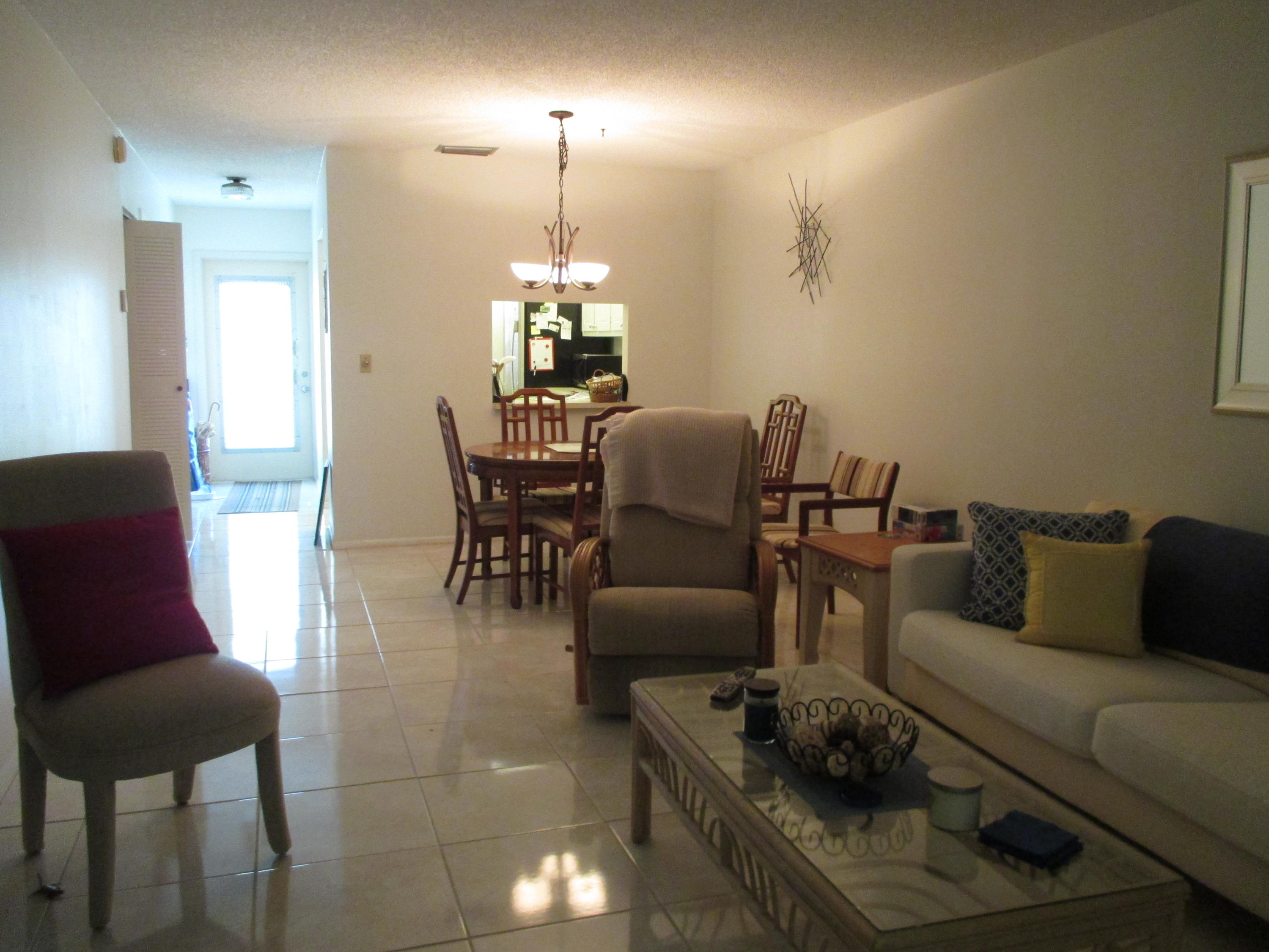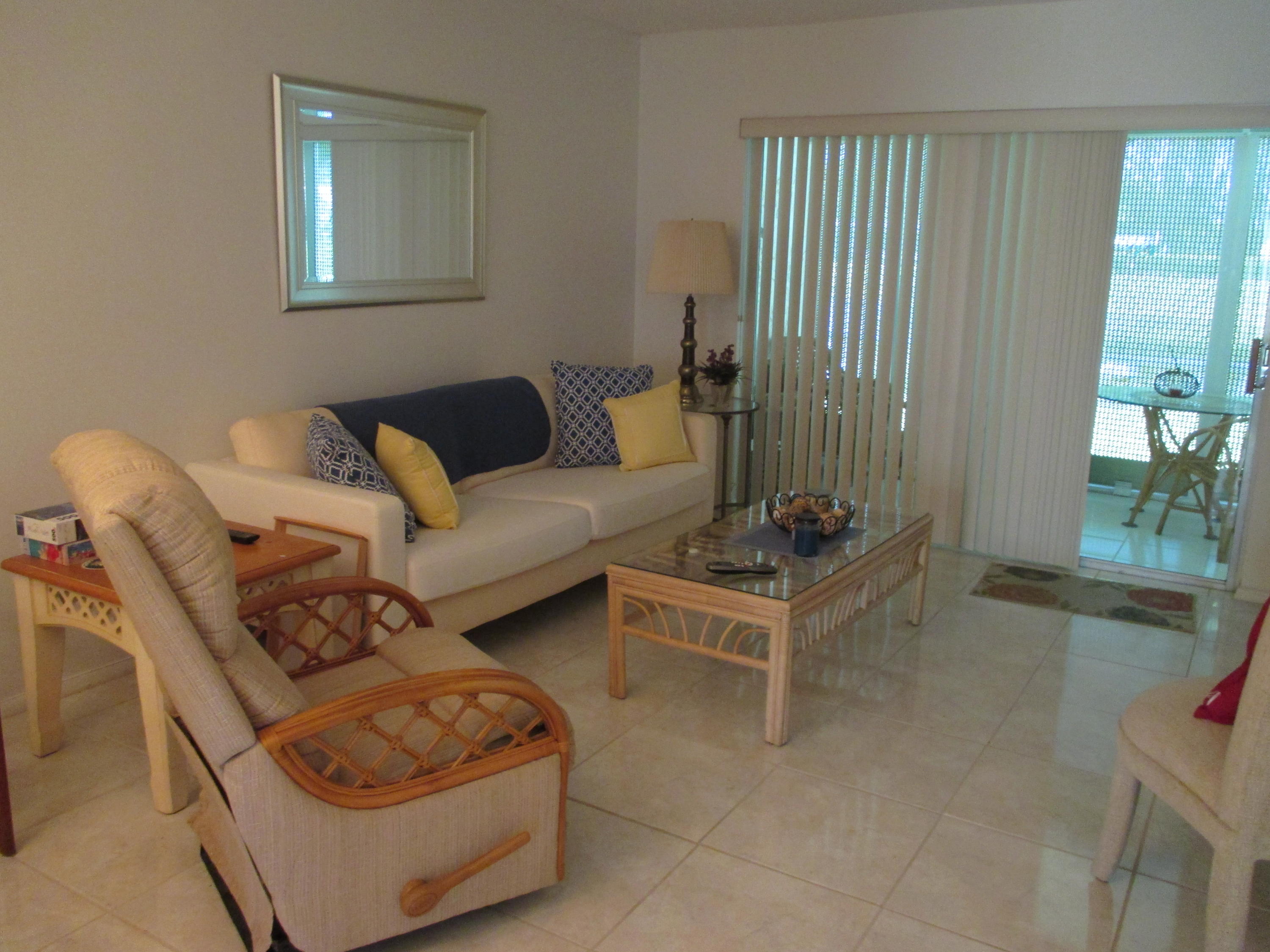 Move-in condition 2/2 Villa. Convertible floor plan with wall up making 2nd BR private. Lg 24x6 screened patio with water views. Accordion hurricane shutters. Guest BR w/laminate wood, new carpet in master BR, LR/Kit tiled. Offered turn-key completely furnished. One pet ok 30 lb limit. One occupant must be 55+. Also, Water/sewer & Comcast cable included with internet in Maint.