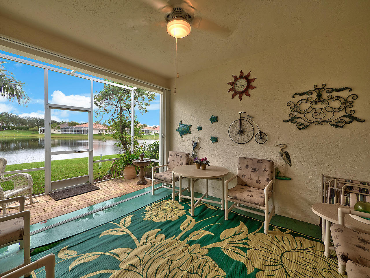 Spacious corner villa with 3 bedrooms and 2 bathrooms. Freshly painted, upgraded light fixtures and ceiling fans. AC is 2 years, washer and dryer are brand new. House has accordion shutters, master has walk in closet. Relax at your screened patio with speakers enjoying the lake view. Driveway for 2 cars. Most of the furniture will stay. Clubhouse offers gym, game room, pool, craft room, aerobic room, movie room, library, ballroom, tennis, bocce and shuffleboard. Active Adult Community. Will not last long,send your offer and enjoy paradise !