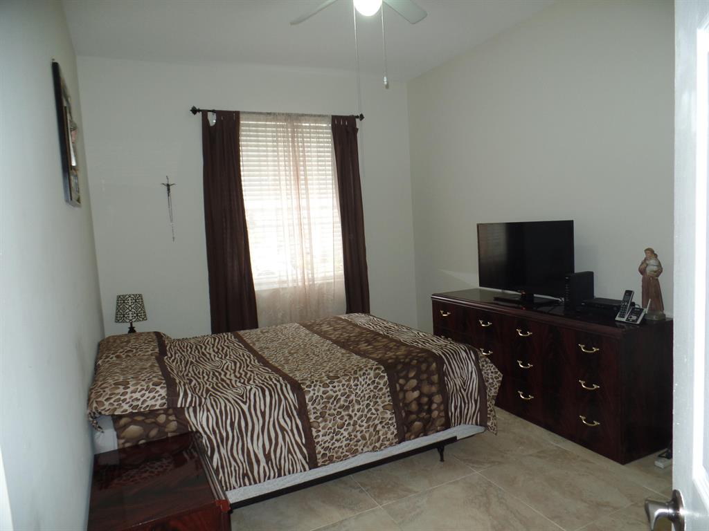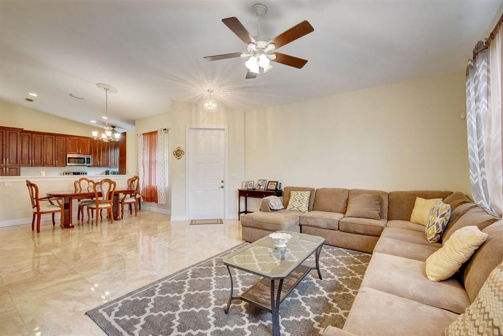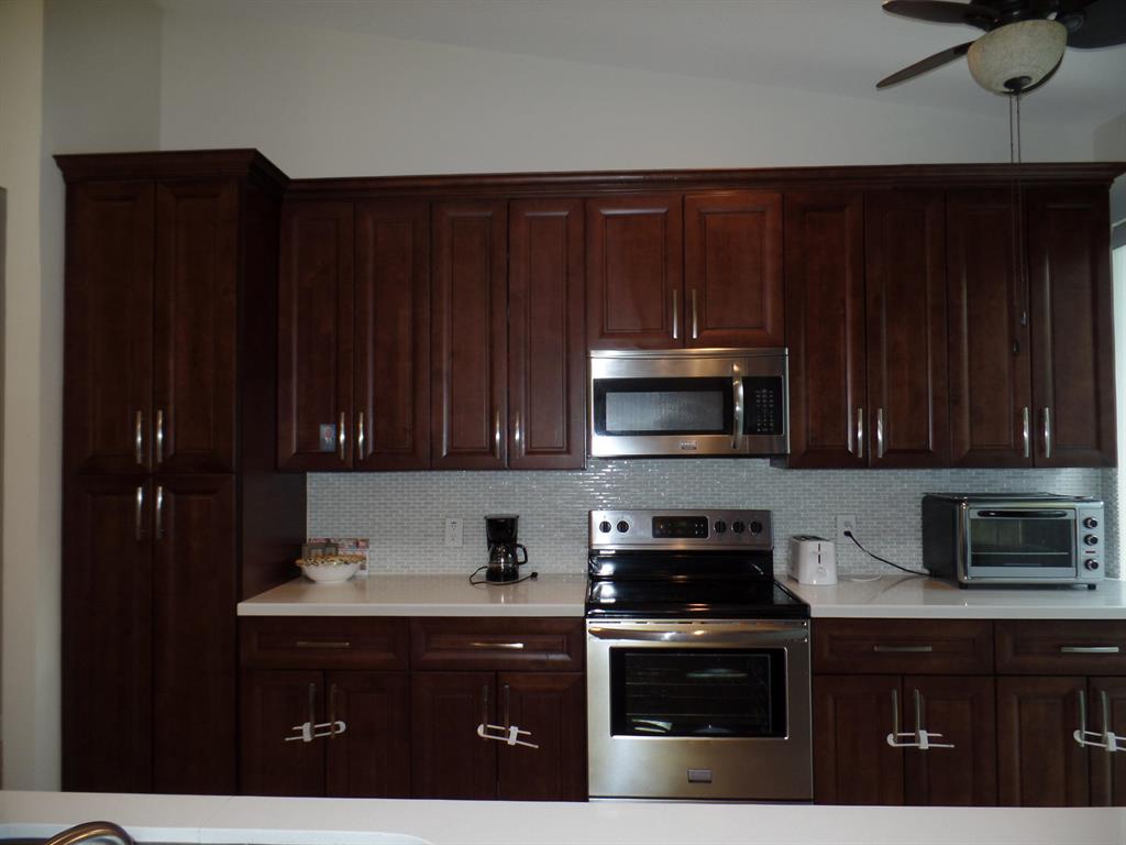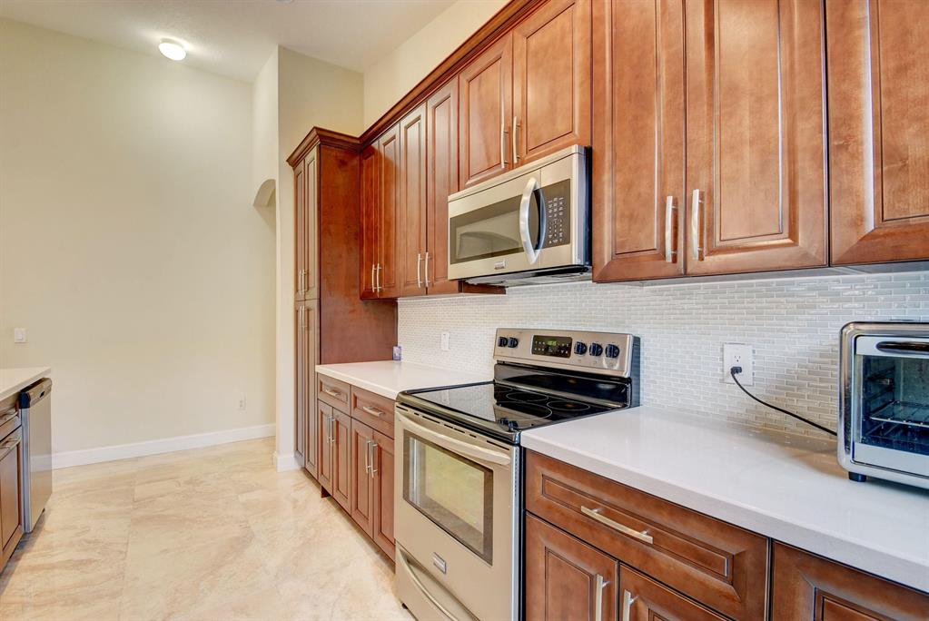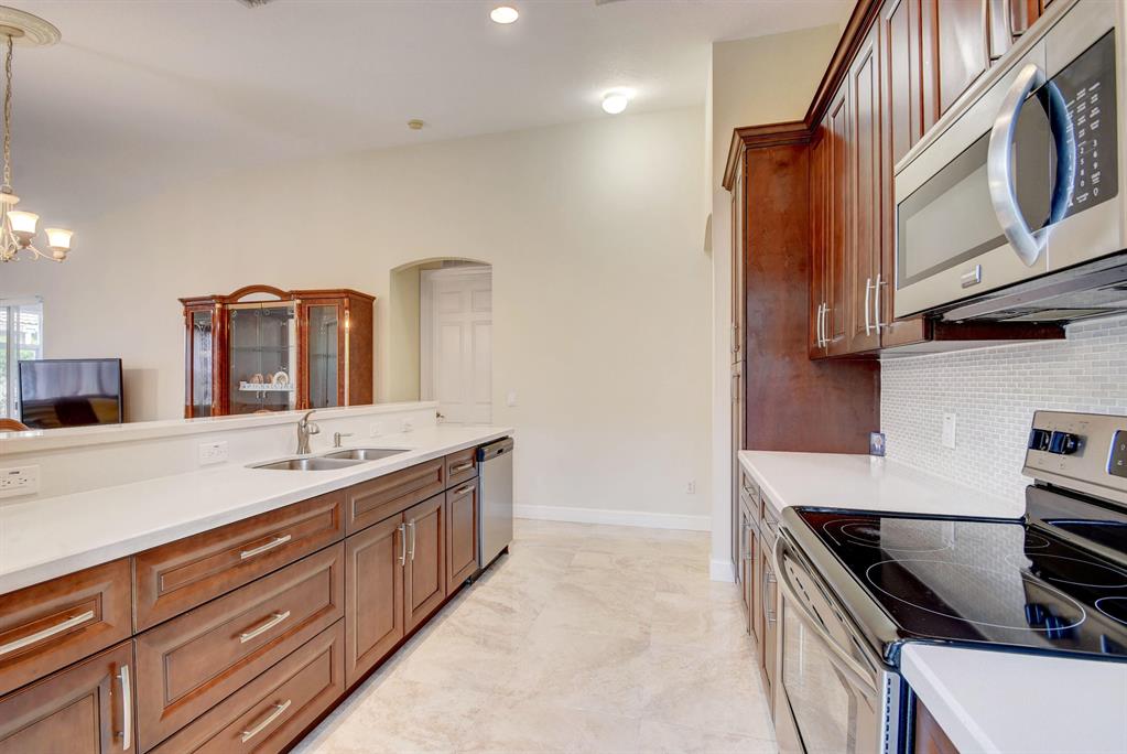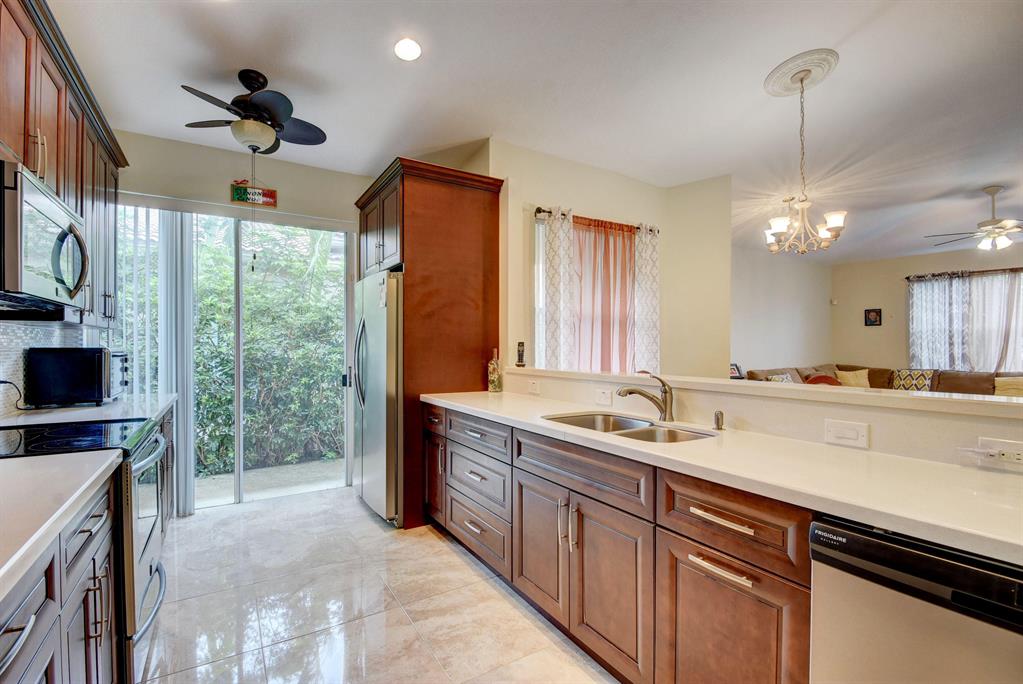 Corner Villa with a private side gated entrance 3 bedroom 2 bath 2 car garage and a large paver driveway. This home has been updated from the floors, bathrooms, newer AC and kitchen. No carpet! Large 24'' porcelain tile floors greet you as you enter this home. Stunning solid wood kitchen cabinets with pull out drawers and soft touch doors adorned with a stylish tiled back splash. Stainless steel appliances and beautiful bright white Corian counter tops! Owners opened the wall to the living room creating an opened floor plan. The volume ceilings make this home feel very large. The bathrooms are updated with new all vanities and gorgeous tiled floors and walls. The master bedroom has a walk in closets. Bathroom walk in shower.