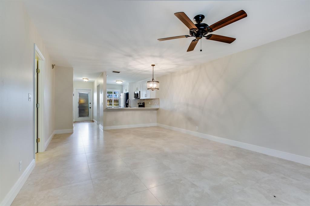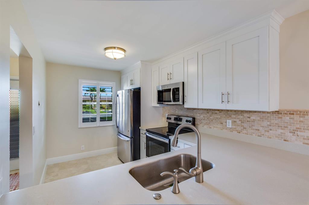 Beautifully remodeled and upgraded 2 bedroom, 2 bathroom waterfront villa with a large enclosed Florida room. Stunning tile flooring thru-out the entire villa with all new baseboards and freshly painted. Gorgeous kitchen with new counter-tops, white cabinetry, tile back-splash, and stainless steel appliances. Enjoy the private waterfront views from the Florida room with no rear neighbors. Both bathrooms have been completely renovated with new cabinetry, tile, and bath hardware. Beautiful plantation shutters cover all the windows in the villa. Located in the gated community of Golden Lakes. Accordion shutters for all the windows. Villa includes full size washer and dryer.