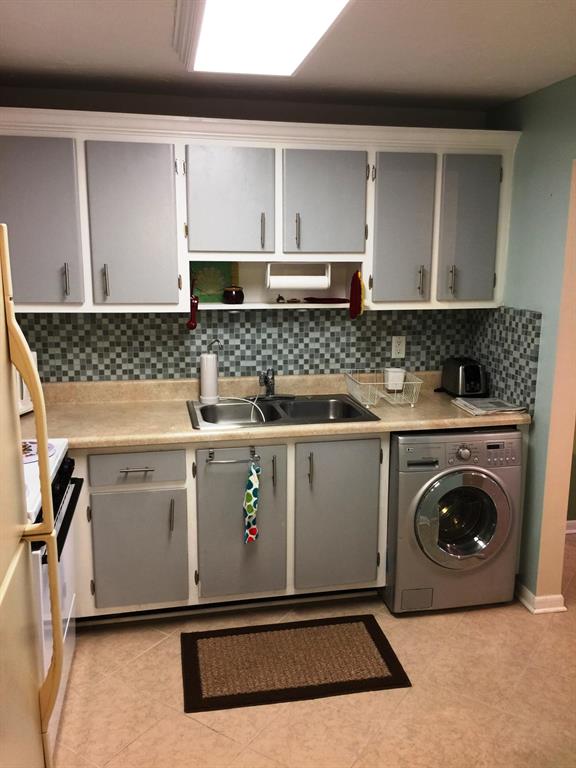 Century Village has so much to offer! Clubhouse, pools, secure gated community, active lifestyle. Lovely, updated 1st floor lakeside condo. Tranquil unobstructed view. Plexi-glass enclosed terrace is perfect for taking in the view. Light & bright. 1 bedroom with 1 1/2 baths, ceramic tile in living area, carpeted bedroom with custom outfitted closets. Contemporary kitchen with ceramic glass backsplash, double SS sinks and built-in full size combo washer/dryer. Decorative ceramic tile detailing in full bath with step in shower. Additional 1/2 bath as well. Partially furnished. Owner has relocated for quick closing.
