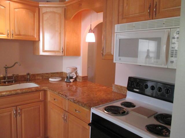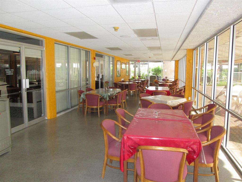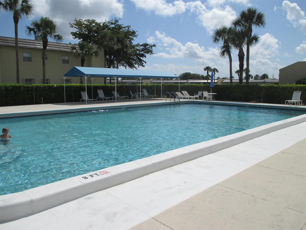 Corner 2/2 1st floor unit which was updated when seller purchased in 2006 with new kitchen, granite counters, all tile floors and Accordion shutters. 30' long screened patio with storage closet. Water & garden view out back. Walk to satellite pool for Lake Meryl. Near Bus stop too. (Courtesy Bus 2 days a week to grocery, malls, shops etc), One sm pet OK, limit 30 lb. One occupant must be 55+.