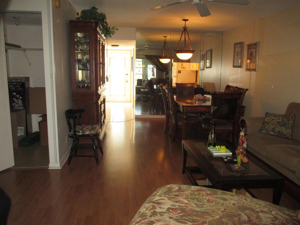 Move-in condition 2 BR 2 BA convertible floor plan. (2nd BR open to the LR) Has accordion door to make BR private. Lg enclosed patio with storage closets, Accordion shutters on all windows and patio. Laminate floors & tile. Some updates in the bathrooms. Kenmore appliances. 5 burner self clean stove. Short walk to satellite Pool for Lake Meryl residents. Laundry facilities in each building on Lake Meryl. Many services included in monthly condo fee. Comcast cable (w/HBO), internet, water, bldg insur, rec facilities, courtesy bus, on site mgr, full time social director, 24/7 guard gated etc. Come discover Golden Lakes Village.