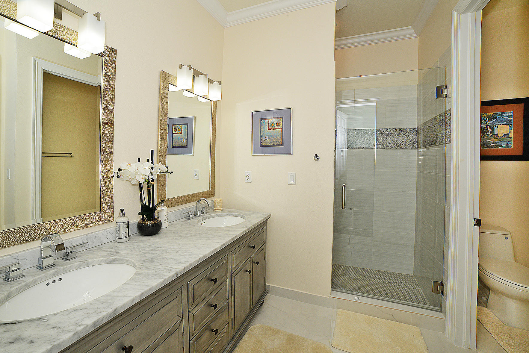 MUST SEE!! PRICED TO SELL!! Corner 2/2 unit fully renovated with a 2 car garage! Hardwood floors, LED recessed lighting. Marble kitchen floors, granite countertops with travertine back-splash, SS appliances. Porcelain tiled bathrooms with new toilets and built-in vanities from Restoration Hardware. Laundry room has built-in cabinets and stackable full size brand new W/D. Custom blinds through-out. Impact windows. 12 foot ceilings with crown molding base boards and ceiling! Nest thermostat and brand new bluetooth garage door opener! 24 hour fitness center and resort style pool. Close to Palm Beach Outlet Shops, I-95, Cityplace, downtown WPB and minutes to WPB airport.