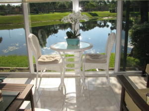 Amazing renovated villa overlooking lake.Natural wood floors,impact windows and doors, ceiling fans throughout, granite counters in kitchen, new applicances,newer water heater and A/C,marble walls and shower in MBA, granite and ceramic tile in guest bathroom.Lovely enclosed patio has serene lakefront views,additional sitting area outside the patio. Monthly dues include water,guarded gate,lawncare,roof,common areas. Very active community offers 2 pools, clubhouse,gym,cafe,lounge,auditorium,shuffleboard,many activities. All measurements are approximate.NO DOGS.