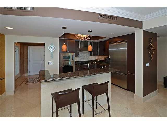 Turn-Key Furnished Spectacular Luxury Unit. Over $150000 in Upgrades. Beautiful & Elegant Crema Marfil Marble Tile Throughout. Custom Built-in Marble Dining Table, Foyer entry w/ Medallion Inlay, White Stone Tile Backsplash, SS Viking Appliances, Crown Mo lding, Master Bath is unbelievable w/ Shower & Jacuzzi Tub. Remote Controlled Blinds in all rooms, Bose Home Theater system, Gorgeous lighting fixtures, & even nicer furniture! Full length unit Balcony has great Pool & Intercoastal Views. 2 Parking Space