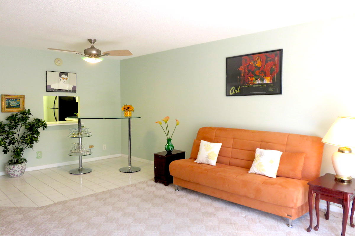 Spacious, second floor, one-bedroom one-bath condo with west-facing terrace. Large bedroom, kitchen with pass-thru to living/dining area, 4 closets (2-walk-ins), hurricane shutters. Laundry and Bonus Storage area in building. Amenities include Pool, Tennis, Clubhouse, Fitness area, Sauna, Barbecue and more. Close to I-95, Palm Beach Outlet Mall, Target and PB International Airport.