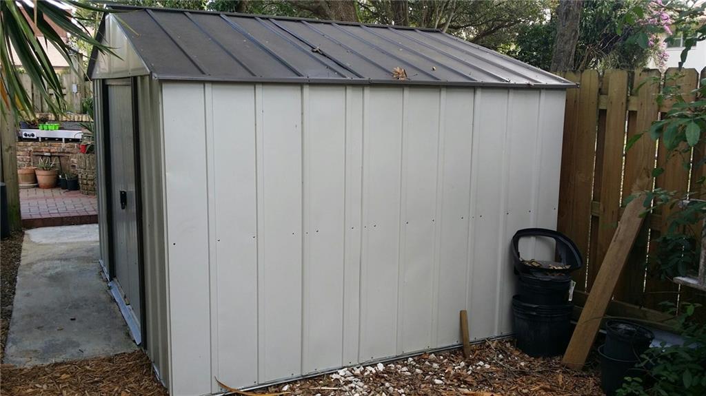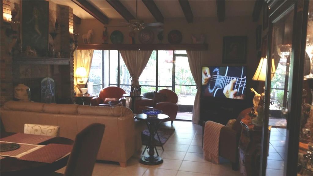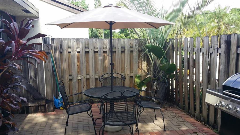 Spacious 2/2 with open floor plan.vaulted beamed ceilings and beautiful brick fireplace in the living room. Completely renovated from top to bottom! 2015 new roof, renovated kitchen and bathrooms..the list goes on. Master bedroom has a newly renovated ensuite bathroom. Sliding glass doors leading to the brick pavers in privately fenced tranquil back garden with built-in-barbeque area perfect for Florida entertaining. Steps from the community park. Storage shed is included.