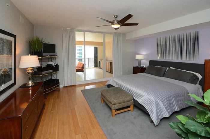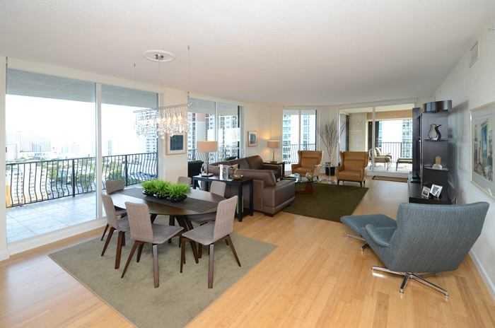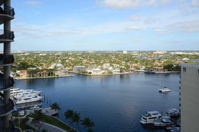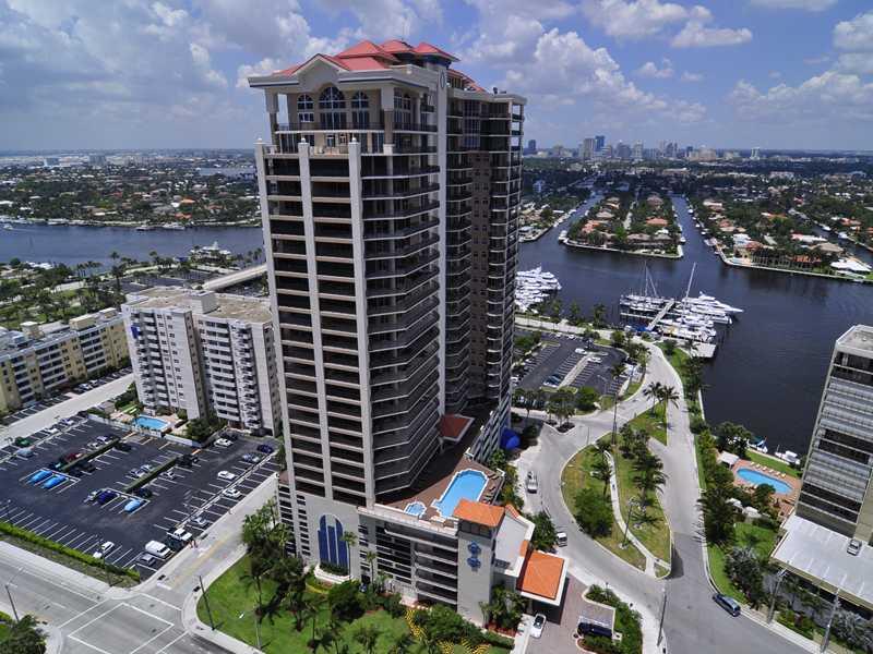 Enjoy the "wow" factor! Chic & sophisticated NE corner residence offers sweeping views from ocean to Intracoastal. Direct elevator service from lobby/garage into the unit which features beautiful bamboo floors, crisp decor & 2 gracious bedrooms plus a den , which could be used as 3rd bedroom. Enjoy twinkling lights and sunsets from huge 1,125 sq ft wraparound balcony, perfect for entertaining. The building offers world class amenities, 2 parking spaces, just blocks from the ocean & Las Olas. Pets welcome!