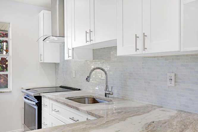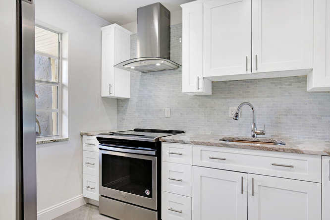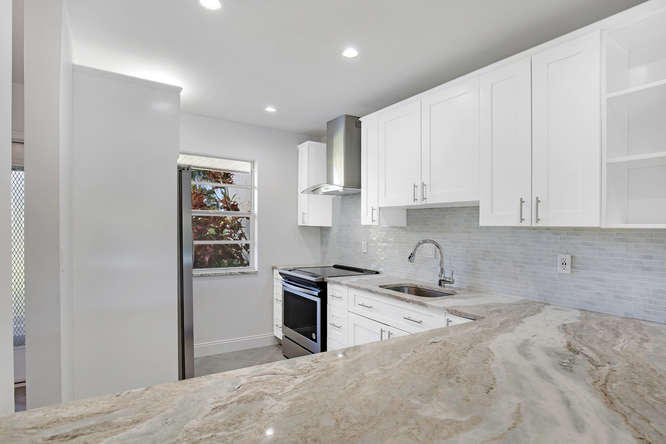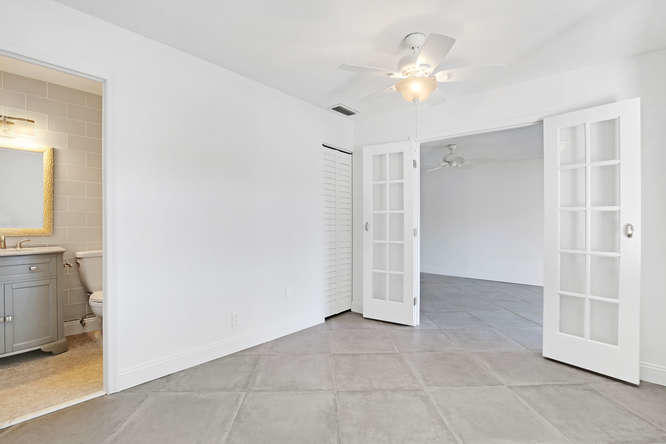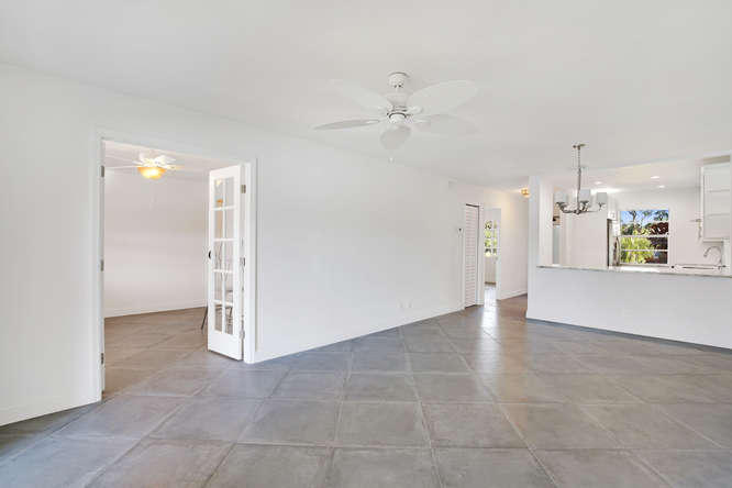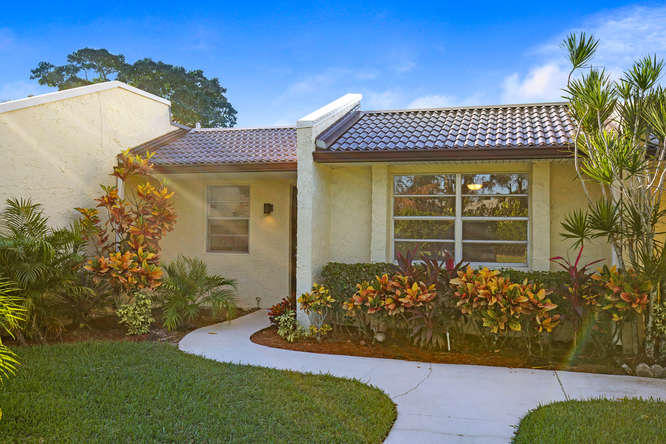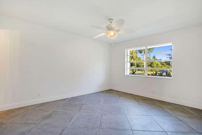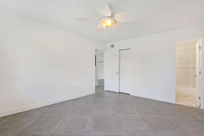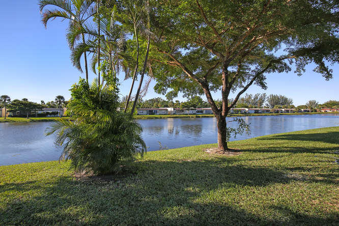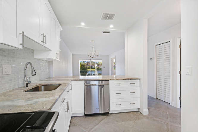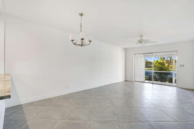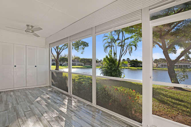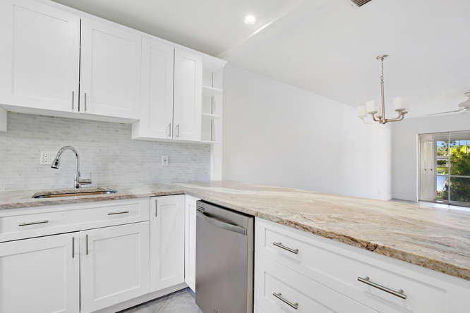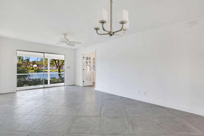 Pet friendly, one small dog permitted. One story waterfront villa with no one over or under you. All new interior. New A/C. Large tiled floors throughout, all white kitchen with stainless steel appliances and granite countertops. Both bedrooms are ensuite. Double french doors lead to 2nd bedroom. Washer, dryer, util sink and another extra closet to store bikes, etc. Gated community with clubhouse, pool, gym, cafe, and plenty of activities. Walk to satellite pool. Close to airport, beaches, shopping and dining.