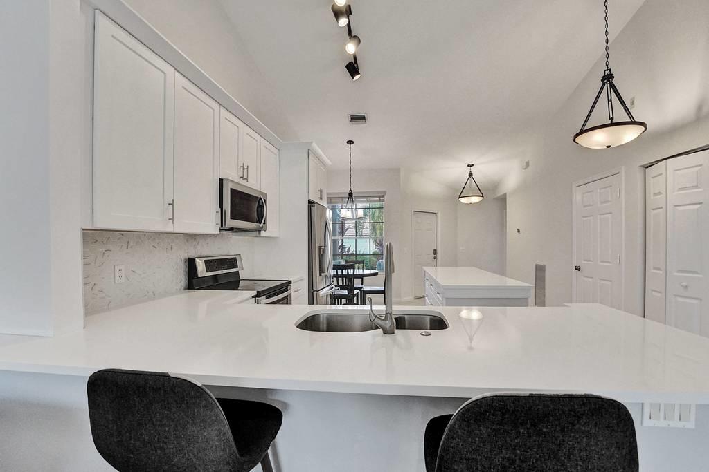 Look no further! Rare and meticulously maintained 2 Bed 2 Bath Villa located in a sought after gated community of Andros Isle. The vaulted ceilings, open concept kitchen, and sparkling lake view greets you at the front door. The home boasts many tasteful features including recently updated kitchen with new stainless steel appliances, quartz countertops, oversized island with built-in storage, 42'' shaker cabinets, soft closed drawers, Lazy Susan, and a spice rack drawer. Both bathrooms are also completely remodeled with Madeli vanities with quartz countertops, Aqua brass valves & fixtures, new Kohler toilets, and a modern alcove tub in the guest bathroom. All bedrooms have Pergo Laminate floor throughout. AC unit replaced in 2018 and freshly painted (2020).