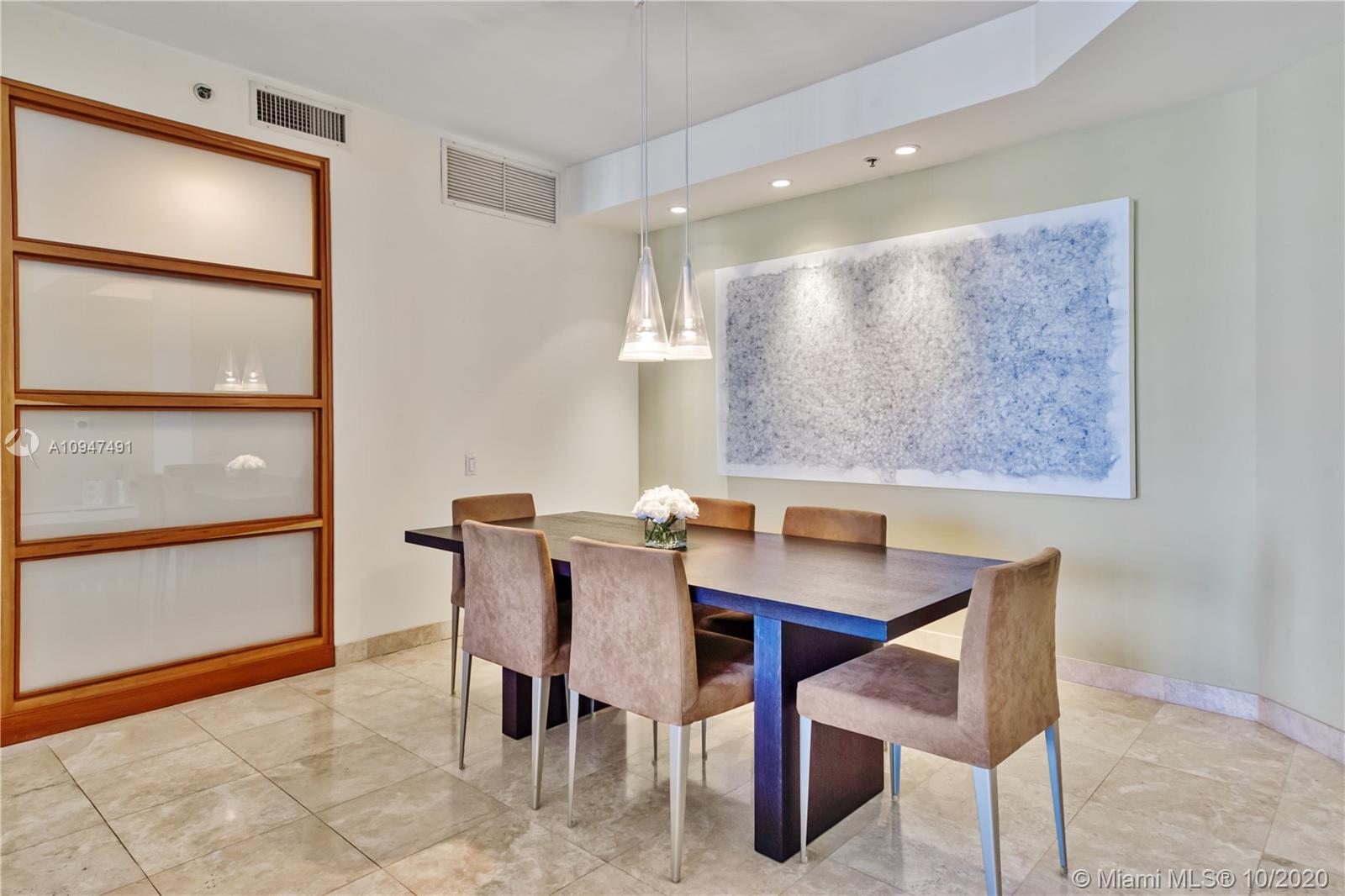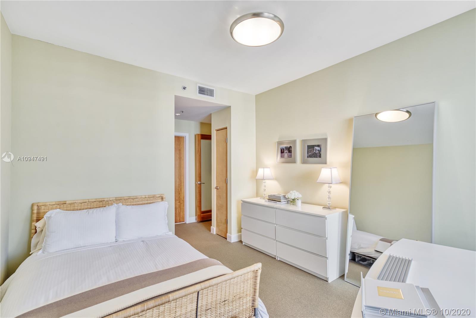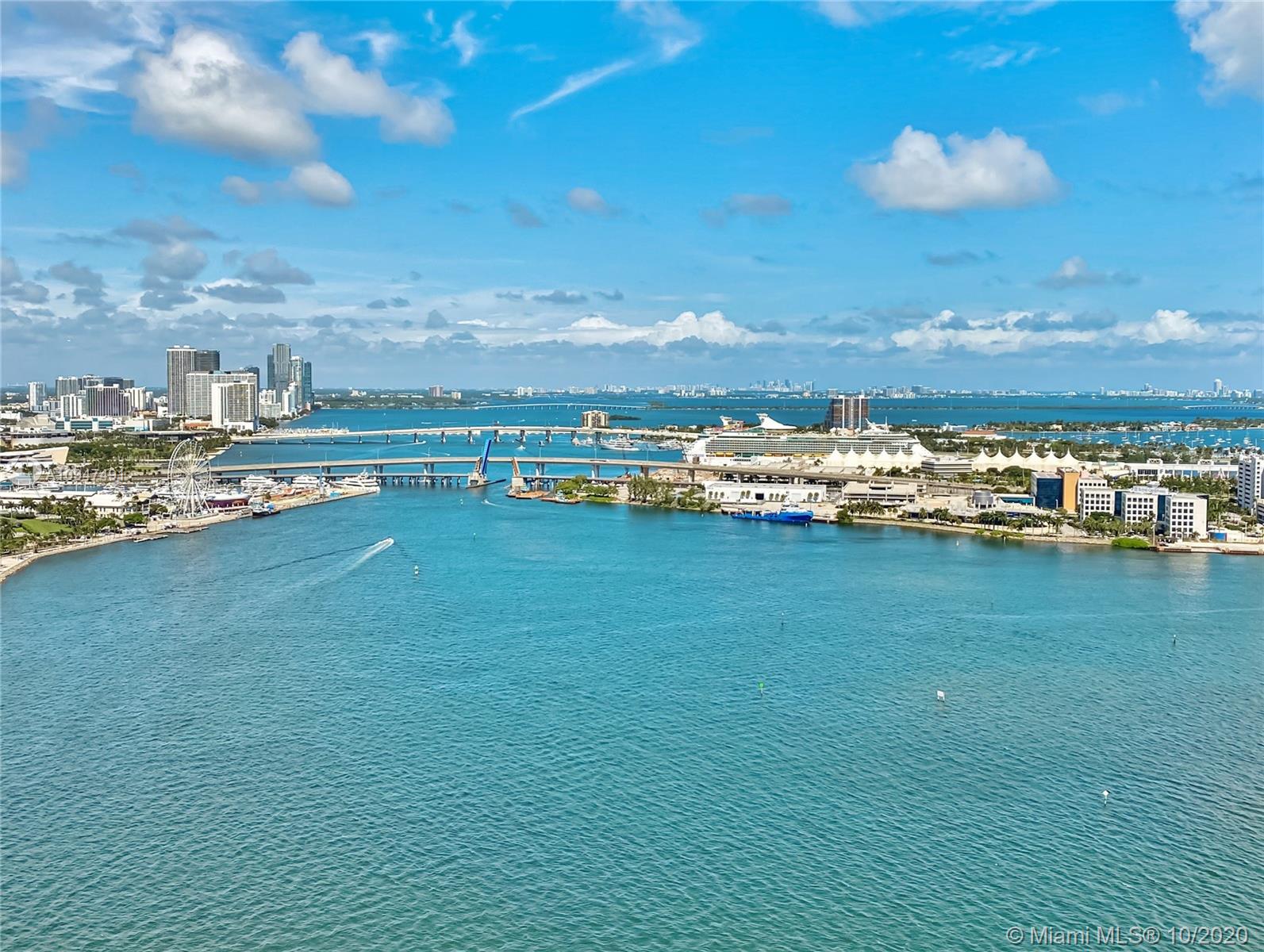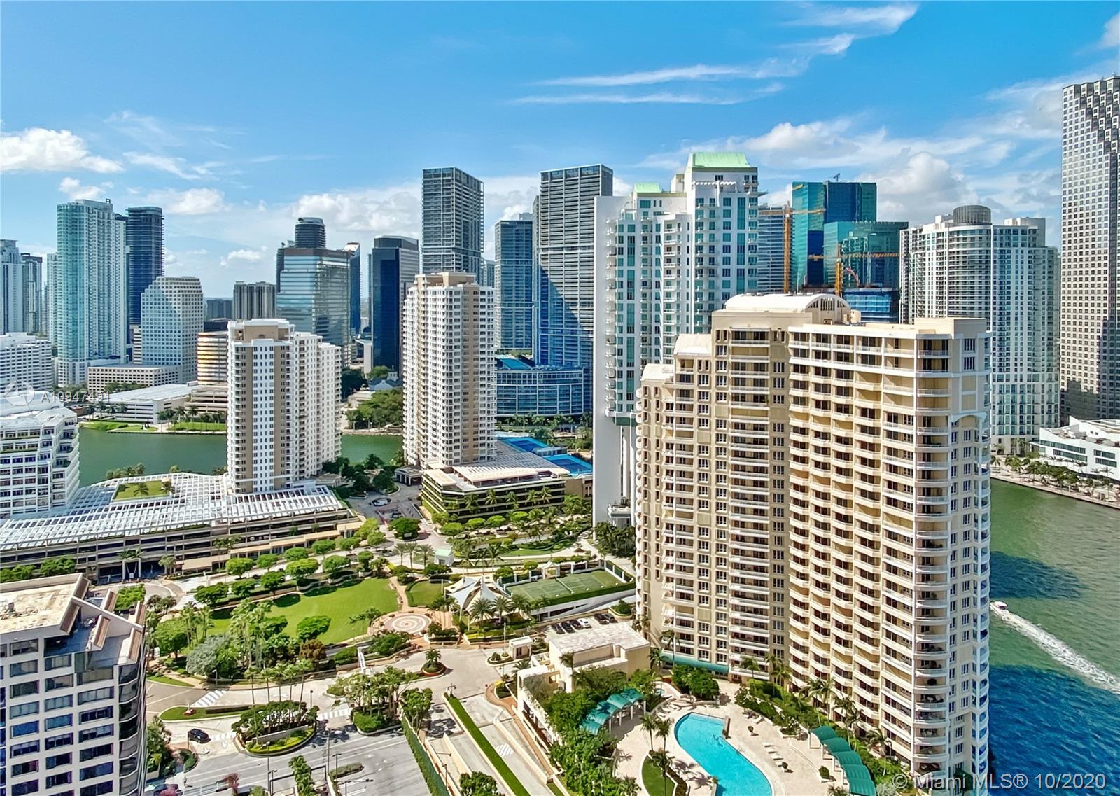 Live in the elegant Two Tequesta Point on Brickell Key - This rare high floor unit has stunning city/bay views from a massive balcony giving you amazing day/night views. The kitchen was remodeled w/ clean line cabinets, a chef's sink, under cabinet lighting, Sub-Zero/Wolf/Asko appliances & custom butcher block countertops. This smart home has Nest, a newer AC, Lutron dimmers, & surround sound TV/Audio. Other upgrades are Italian light fixtures, shades throughout (including blackout in bedrooms), & designer walk-in closets & doors. Two Tequesta has a renovated lobby/elevators, tennis, one of the nicest fitness centers in Miami, a bayside resort style pool with hot tubs, a BBQ area, a new Party room, conference rooms, a kids room, free common area wifi, free 24/7 valet, 24/7 security, & more