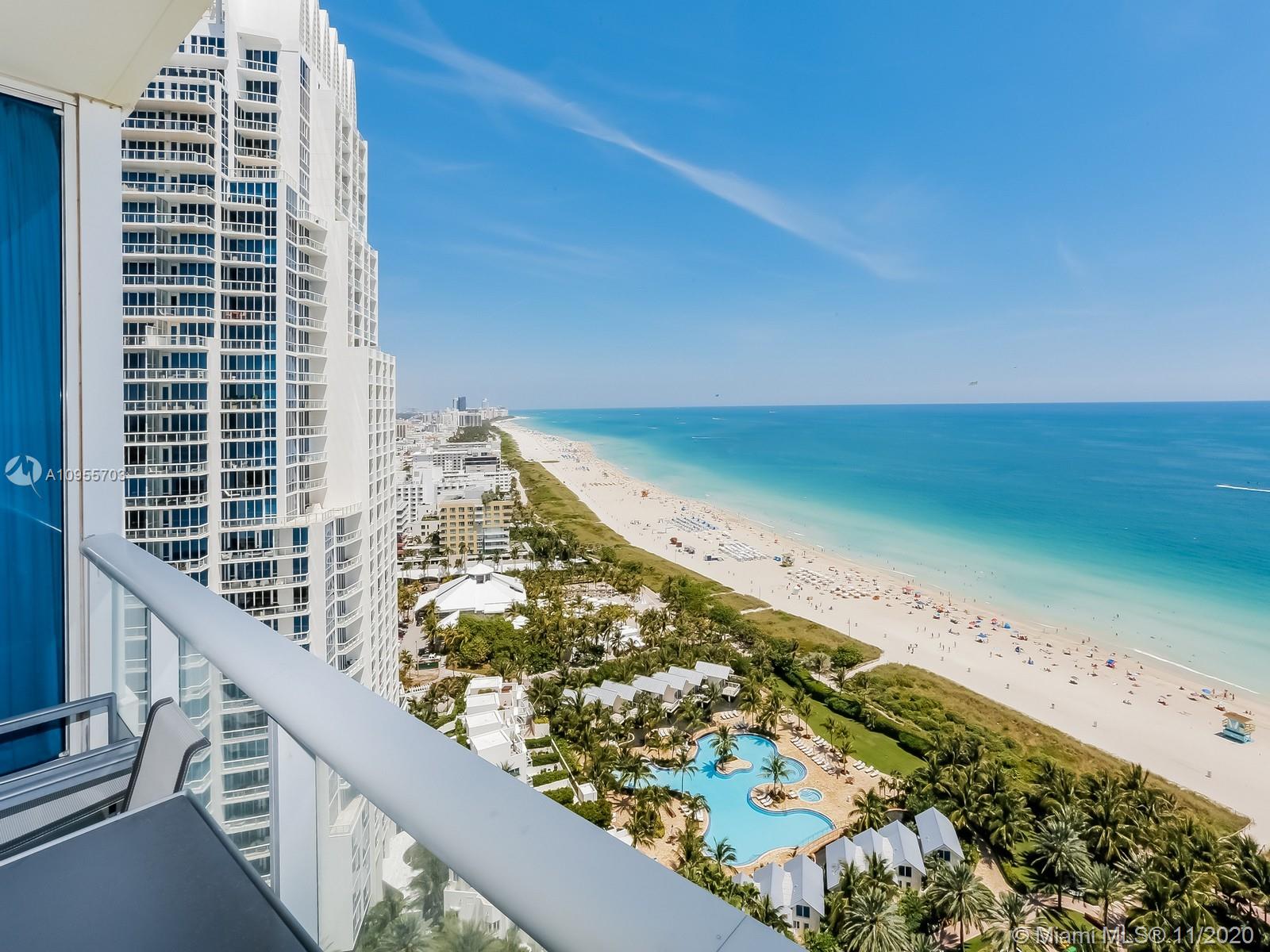 Award winning unit. Completely designed by New York's Acclaimed Slade Architecture. One of a kind unit boasts custom walls, cabinetry in whitelacquer. Floors with hints of blue and green, and beautifully furnished. The second bedroom has a retractable wall that provides the ultimate in versatility. Direct views of the ocean and infinite views of the world famous Beach.