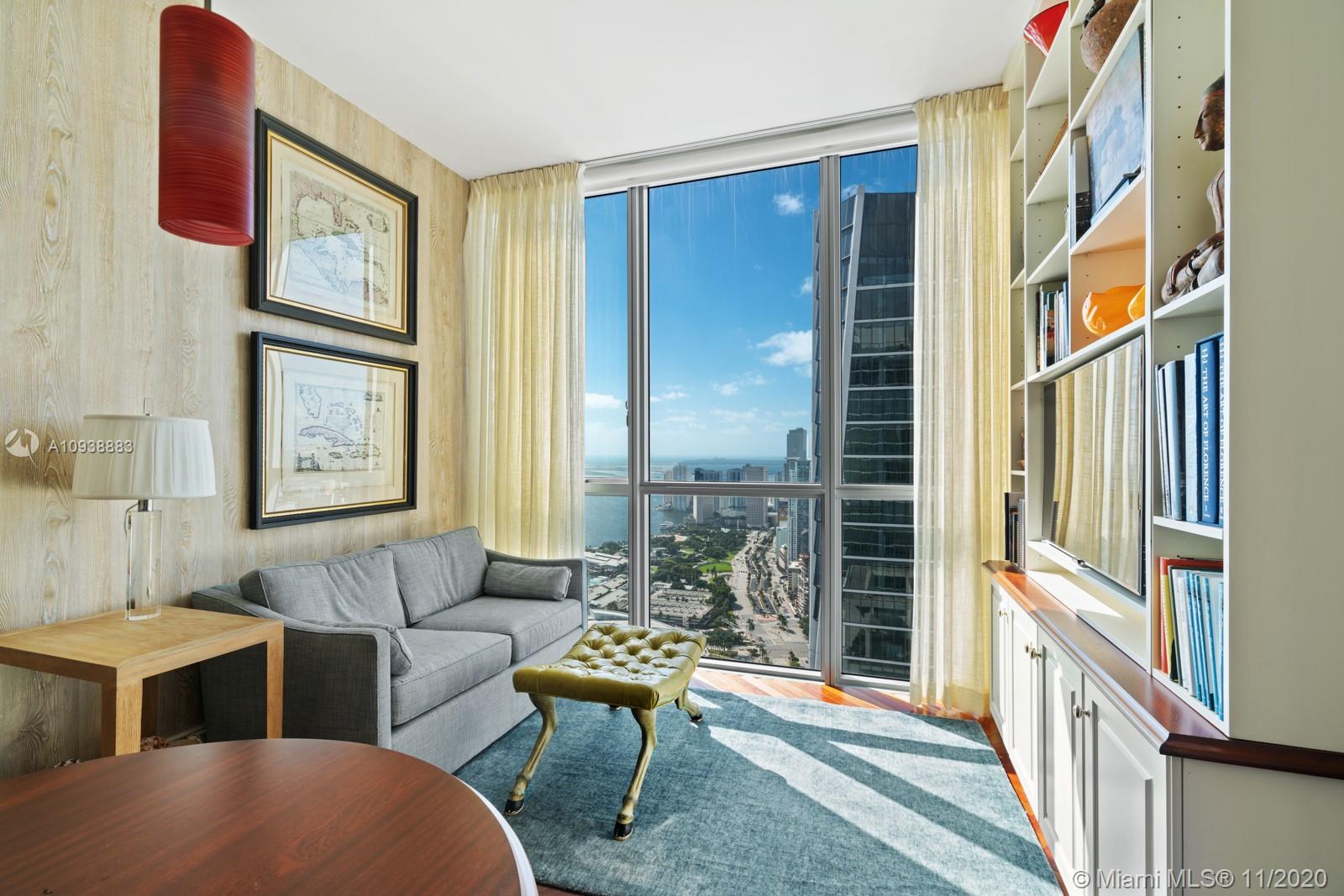 Views, Views and Views from this unique south corner residence at Marquis. Enter the foyer through a private elevator and enjoy expansive views of Biscayne Bay, Miami Beach and the Miami Skyline from its bright and open double wide living room with floor to ceiling glass windows. Professionally remodeled, this residence has been converted into a 1-bedroom master suite that connects to a second room perfect for a home office, gym or lounge. Custom kitchen has Viking appliances, cream leather wallpapers, black marble floors and backsplash, with walk-in pantry. Marquis offers the ultimate lifestyle with unparalleled access to the Design District, the Adrienne Arsht Center, Museum Park, the American Airlines Arena, Joe’s Stone Crab, Miami Airline Terminals, and Metro Mover station.