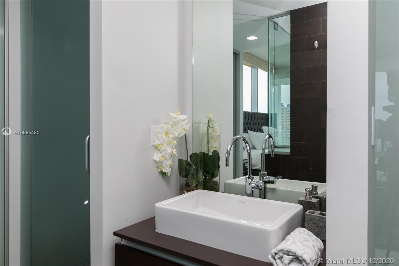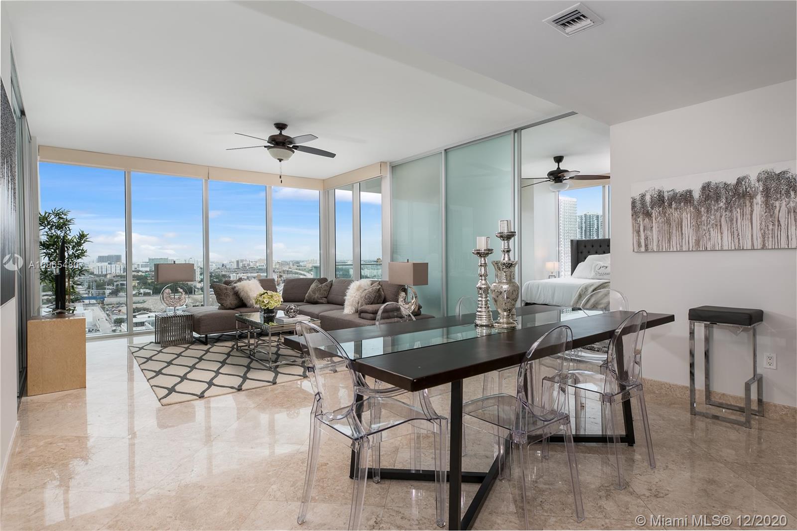 Unit 1506 at Ten Museum park is a FULLY furnished corner two bed and two bath condominium home with north west exposures overlooking the city's skyline. The unit is exquisite light-filled and professionally decorated, marble floors, spa-like master bathroom, airy kitchen featuring high-end stainless-steel appliances. The entrance foyer leads you to an open concept surrounded by glass impact windows overlooking the city. Ten Museum park is a boutique building bringing exclusivity, comfort and state of the art services to it's residents encompassing fitness center, spin studio and yoga room, full-service spa equipped with steam room, snow room and treatment rooms - pool deck with resistance and plunge pools, lounge chairs, and hot tub. Perfect primary residence, pied-a-terre or investment.