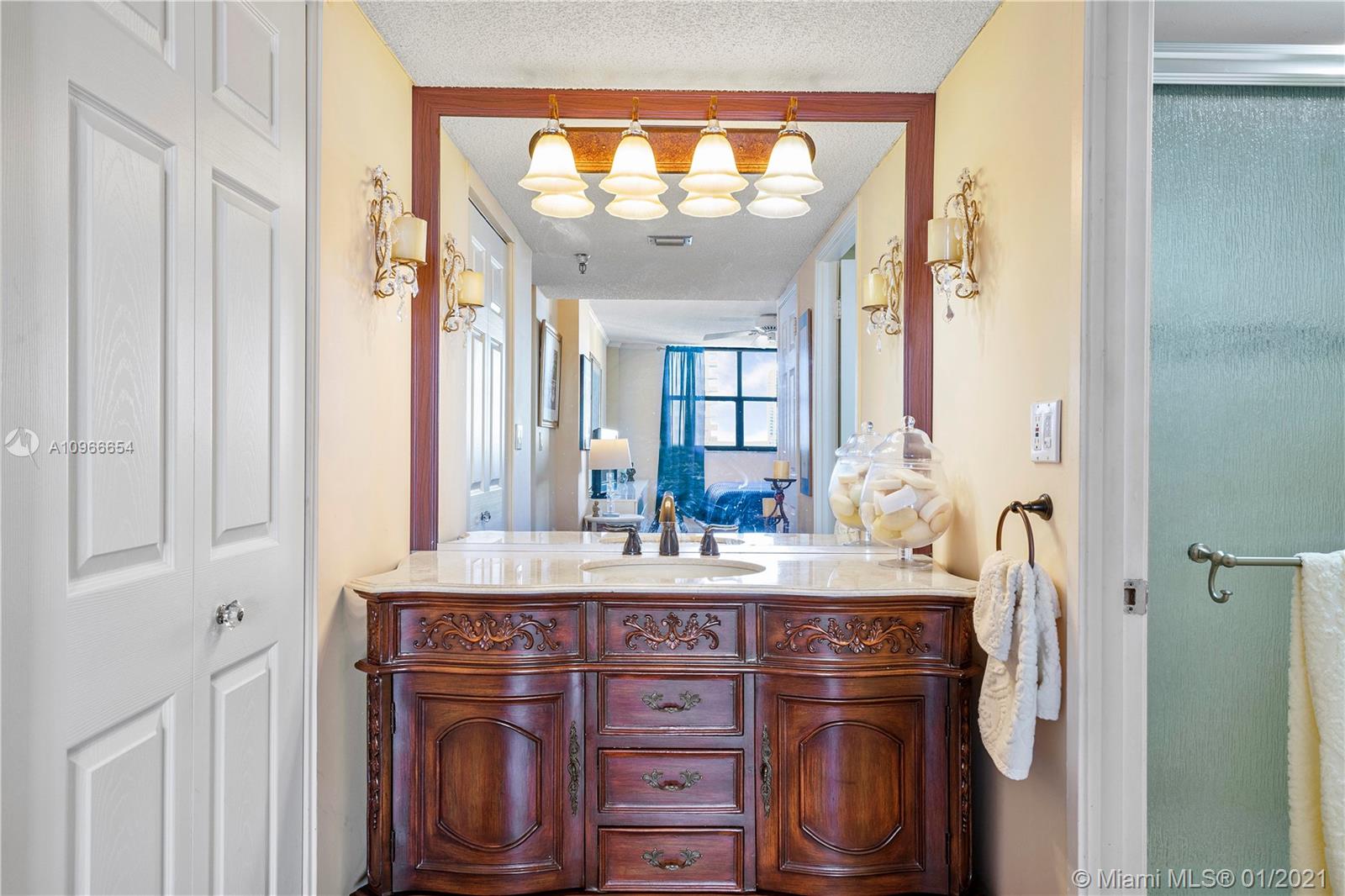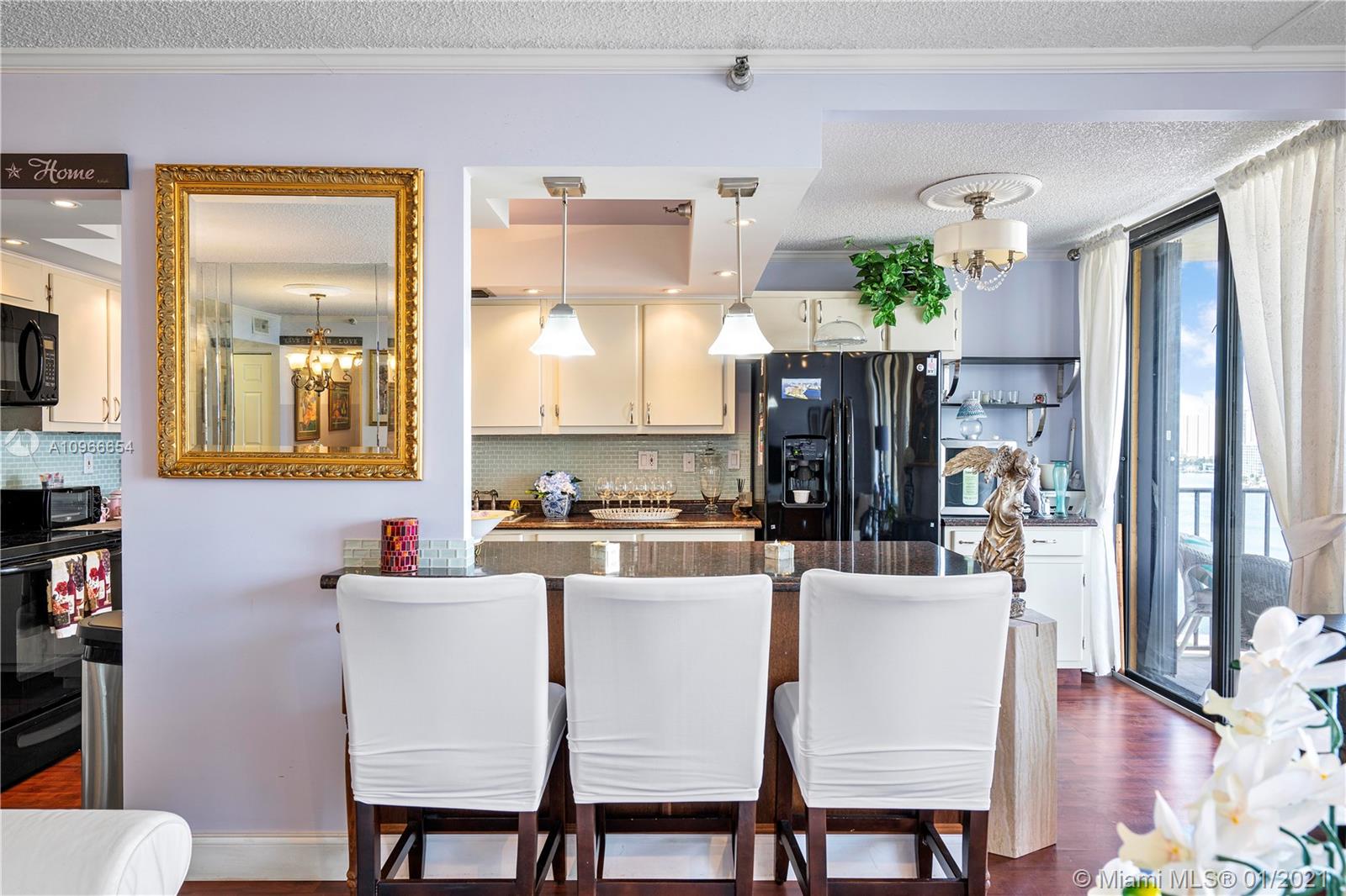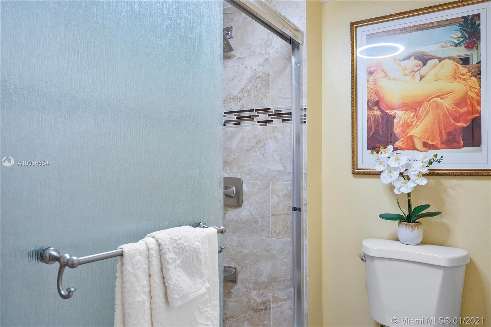 Beautiful 1/1.5 unit fully remodeled. Open kitchen. Renovated bathrooms. Spectacular view of the Ocean and wide city. Washer and dryer inside the unit. Located in the most luxury of Winston Towers, building offers many amenities such pool, gym, sauna, library, meeting room, game room, tennis court and many more. Walking distance to the Ocean. Apartment is actually larger than Tax Roll 1080 SqFt. Parking is deeded
