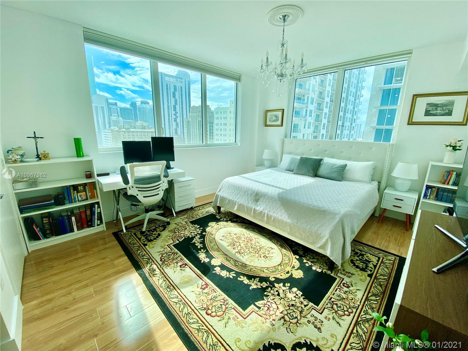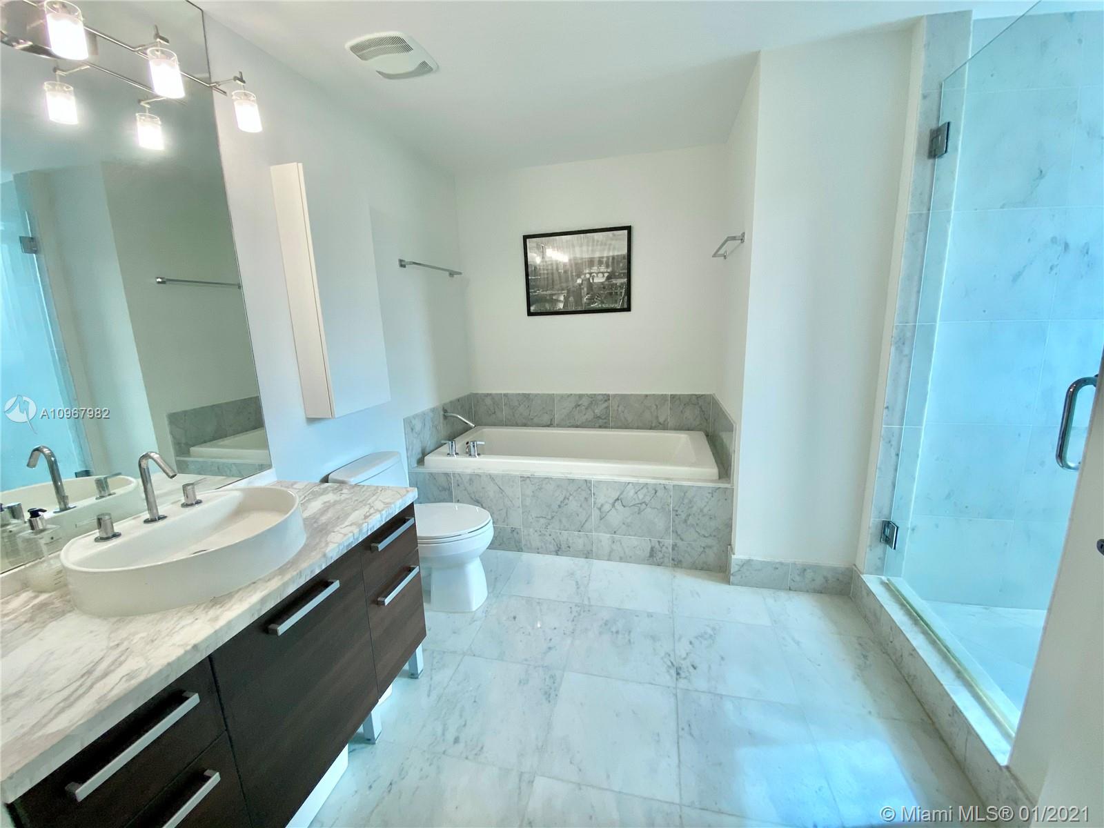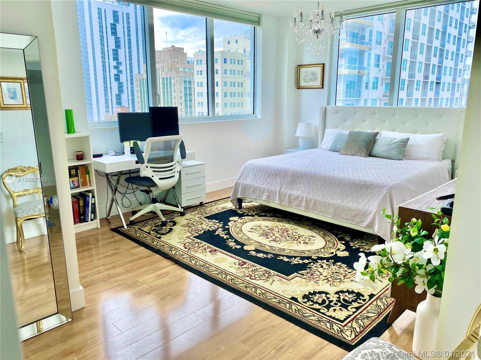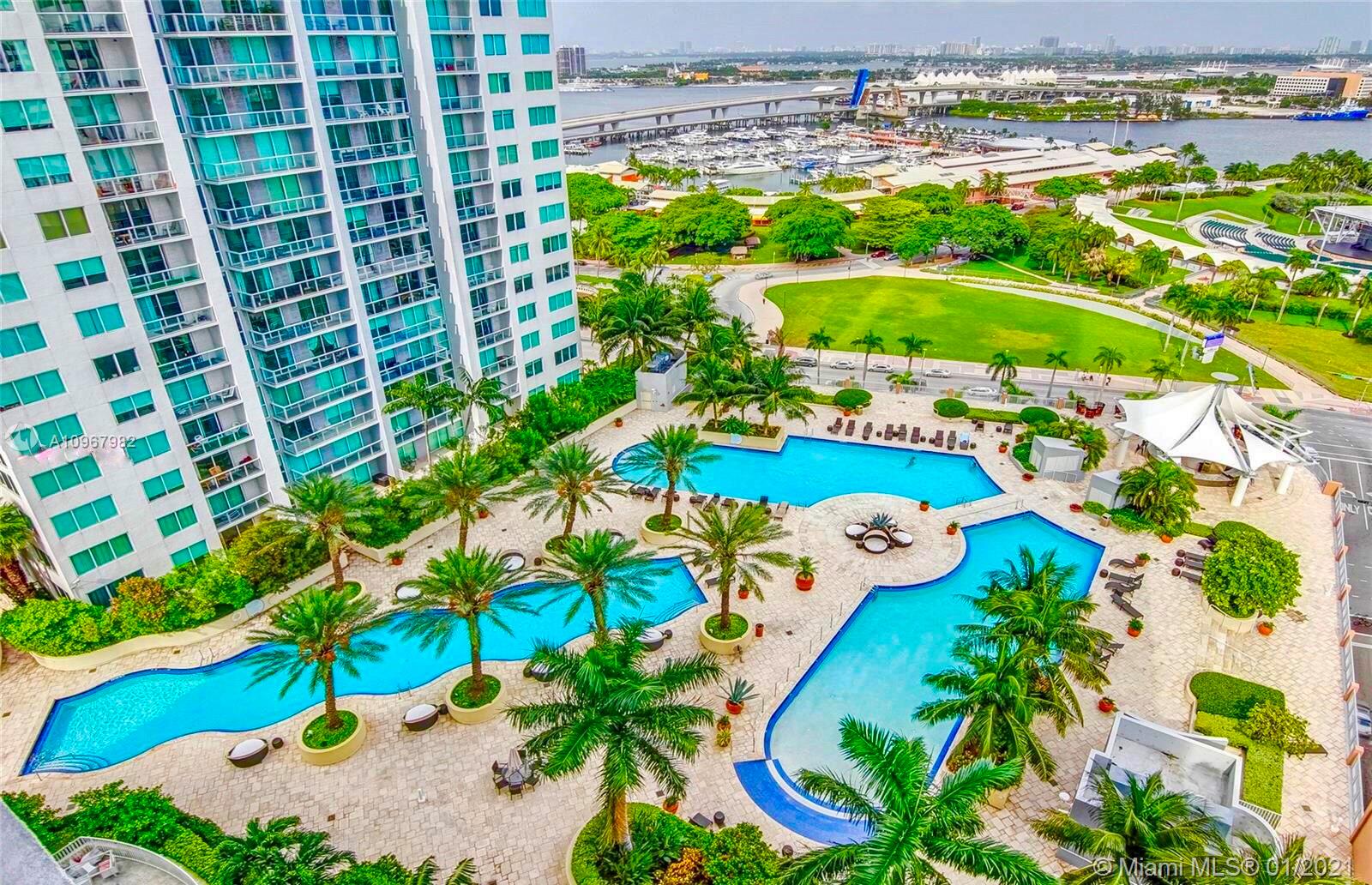 Unique one of a kind spacious corner unit (1,146 SqFt) at the Luxurious twin-tower Vizcayne Condo in the heart of Downtown Miami. Completely renovated and 100% custom-built 1 BR + Converted Den/ 2 Full Baths. Oversized Master Bedroom. Den converted to a second bedroom with built-in closets & sofa converts to a queen bed. Living room has a custom marble island with a built-in TV. Kitchen has high-end Stainless Steel appliances & marble countertops. 2 Full bathrooms with marble floors, showers & glass doors. Huge custom walk-in closet. New Full-size washer & dryer. Beautiful honey-color Real Wood Floors (NOT laminated). Unit comes with 1 parking space and 1 storage unit. Condo offers 5-star resort-style amenities; 4 tropical pools, jacuzzi, spa, gym & 24 hr lobby receptionists and security.