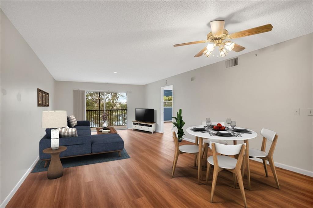 Perfectly placed Century Village home with gorgeous lake views! Offering easy access to the community pool, health club, and clubhouse and only steps from the elevator this third central location has it all. The light and bright interior features updated laminate wood flooring that perfectly complements any decor and makes daily cleanup a breeze. Enjoy serene lake views from your screened balcony offering the ideal outdoor expansion to the living room.