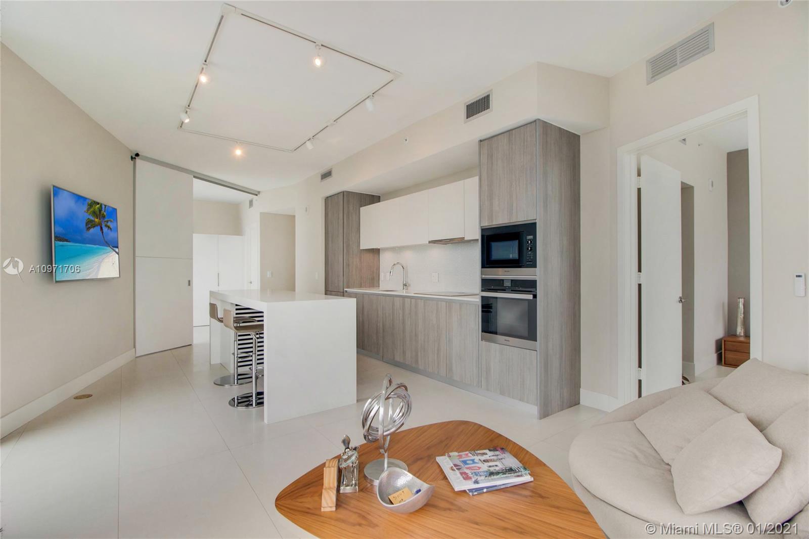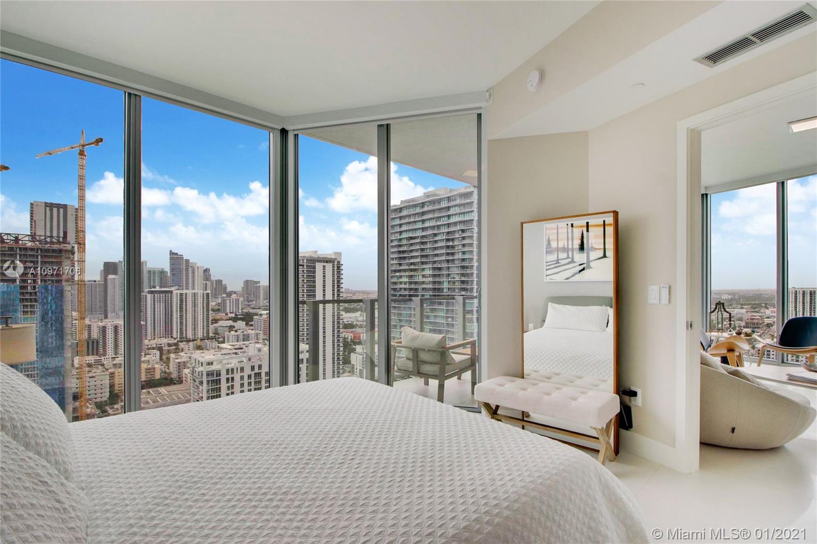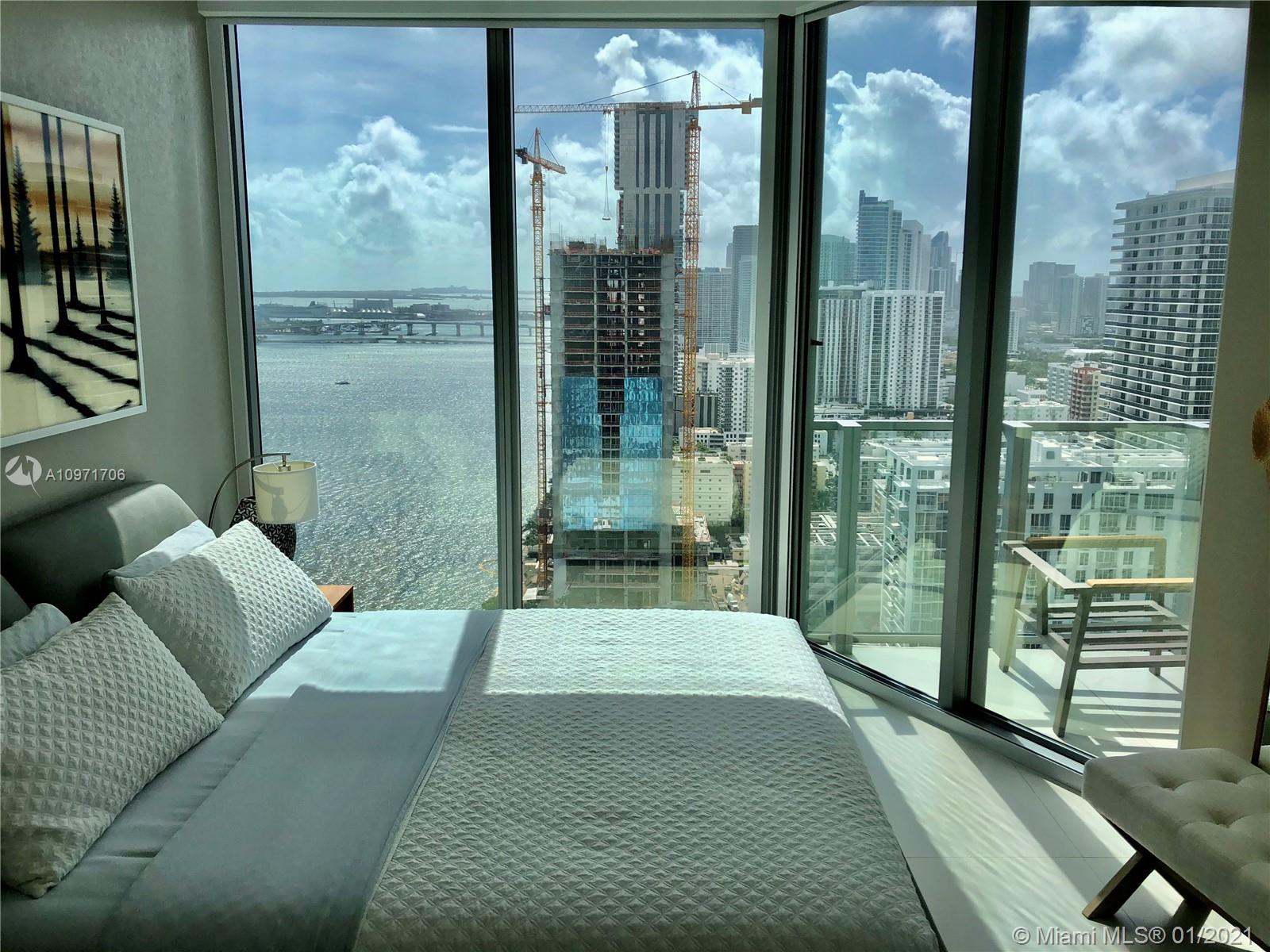 Beautiful upgraded 1 bed + den (enclosed with murphy bed) and 2 baths at luxury building. Professionally decorated by Brazilian designer Myrna Porcaro. Upgrades include kitchen island and wine fridge, wallpaper, vertical garden pillar, murphy bed, & electric shades. Tile floors throughout. Beautiful VIEW OF BISCAYNE BAY, Edgewater & Downtown Skyline, and sunset view. Private Elevator with private foyer entrance; Snaidero Kitchen with Miele appliances; 10 ft ceilings with floor to ceiling glass windows; spacious balcony. Amazing AMENITIES with a Beach Club, elevated sand/beach area, bayfront pool, sauna & steam room, 2 massage rooms, tennis & basketball courts, beach volleyball court, state of the art gym, 6th floor with 2nd pool, bbq area, 2 party rooms. Assigned parking (#233)
