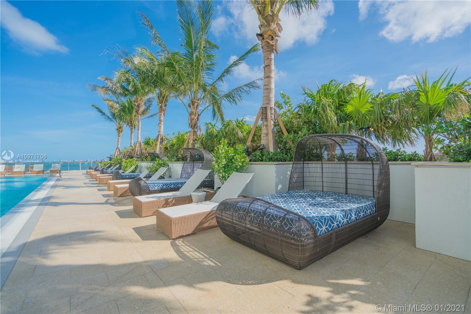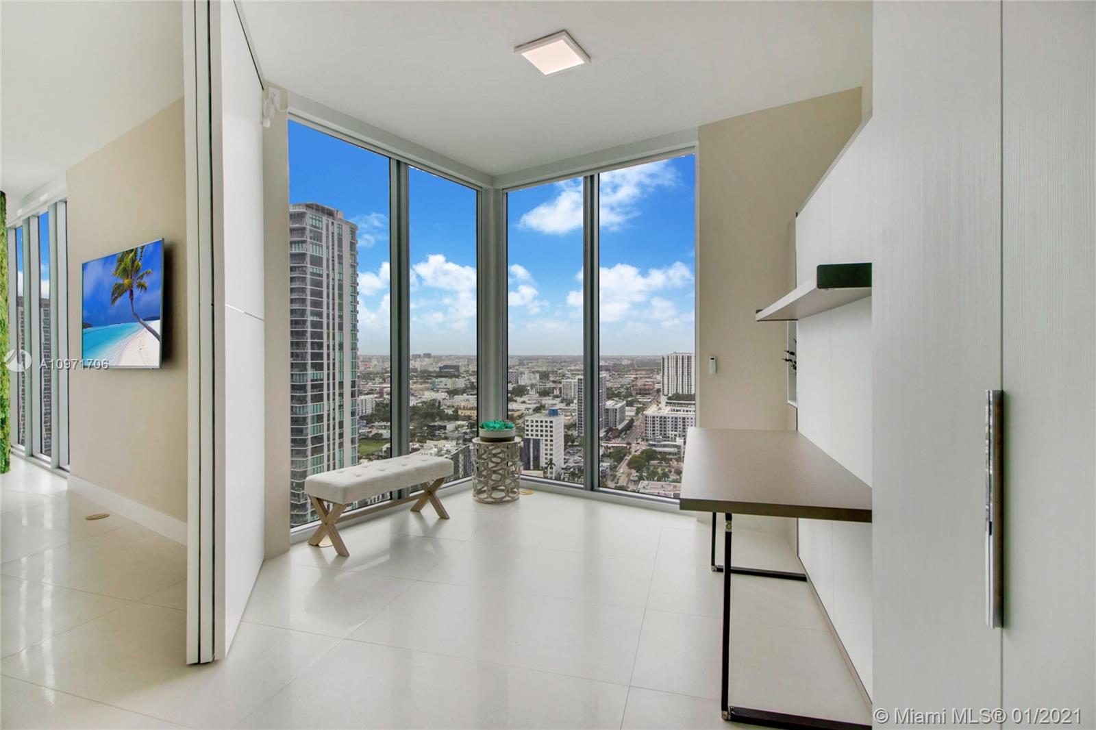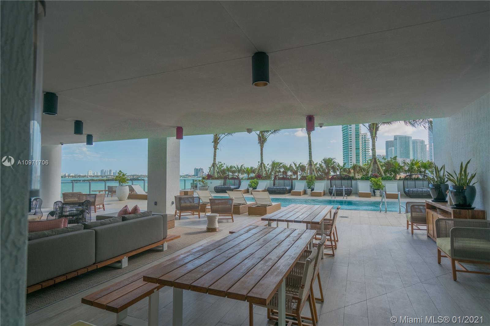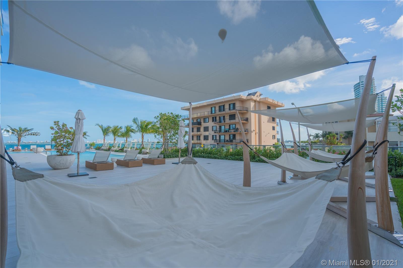 Beautiful upgraded 1 bed + den (enclosed with murphy bed) and 2 baths at luxury building. Professionally decorated by Brazilian designer Myrna Porcaro. Upgrades include kitchen island and wine fridge, wallpaper, vertical garden pillar, murphy bed, & electric shades. Tile floors throughout. Beautiful VIEW OF BISCAYNE BAY, Edgewater & Downtown Skyline, and sunset view. Private Elevator with private foyer entrance; Snaidero Kitchen with Miele appliances; 10 ft ceilings with floor to ceiling glass windows; spacious balcony. Amazing AMENITIES with a Beach Club, elevated sand/beach area, bayfront pool, sauna & steam room, 2 massage rooms, tennis & basketball courts, beach volleyball court, state of the art gym, 6th floor with 2nd pool, bbq area, 2 party rooms. Assigned parking (#233)
