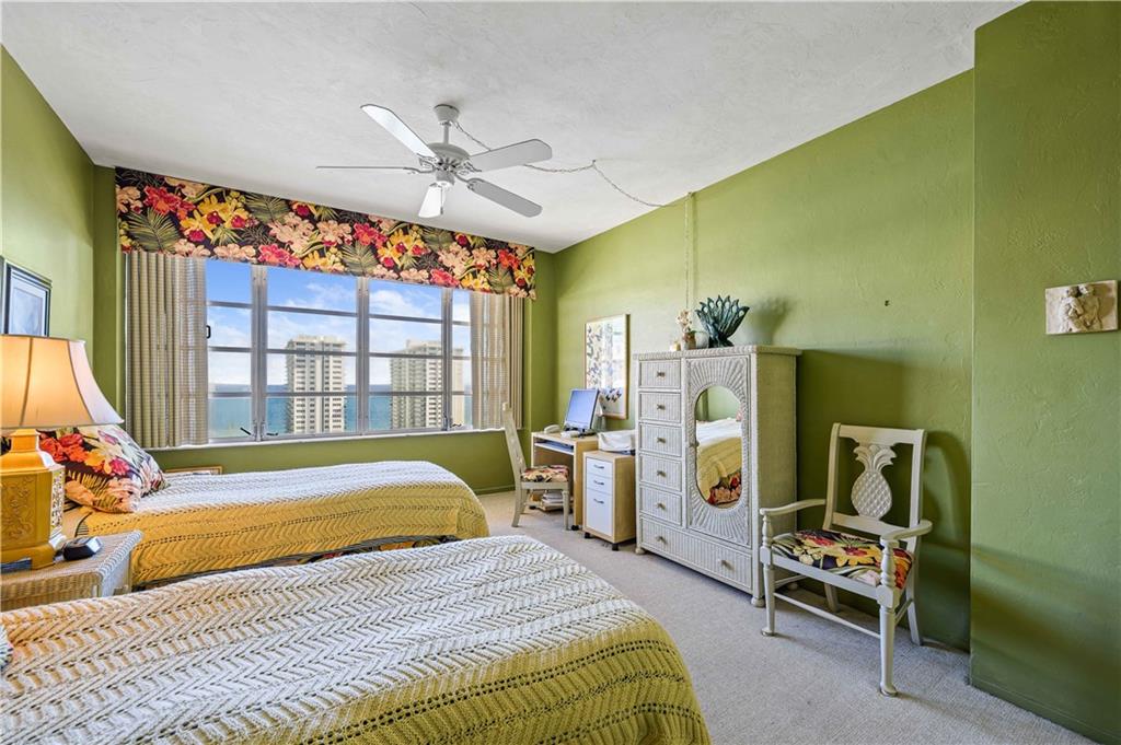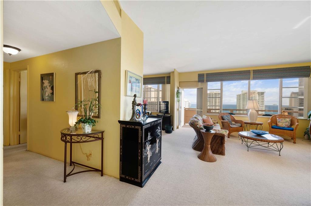 Southeast Corner Penthouse with stunning expansive views of the ocean south including the downtown Fort Lauderdale skyline and a large balcony to take it all in. Bright and open living space with the primary en suite bedroom offering ocean views and a walk-in closet. Second bedroom currently being used as a den that opens up to the living room. Higher 9' ceilings, newer A/C and hot water heater. With an immaculately maintained building and amenities, this location has so much to offer. No car needed with easy access to the beach, restaurants, shopping, banks and water taxi. Last sold in 1997, this is a rare opportunity to own the most desirable unit in any building - the SE CORNER. Property Taxes, cable TV & reserves included in monthly maintenance TOTAL $1,056/month. One owner 55+.