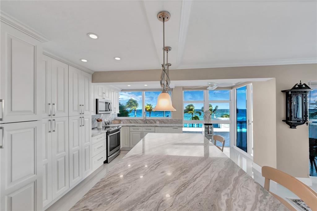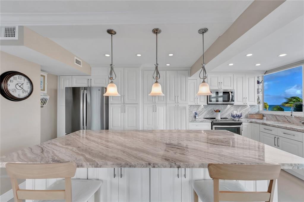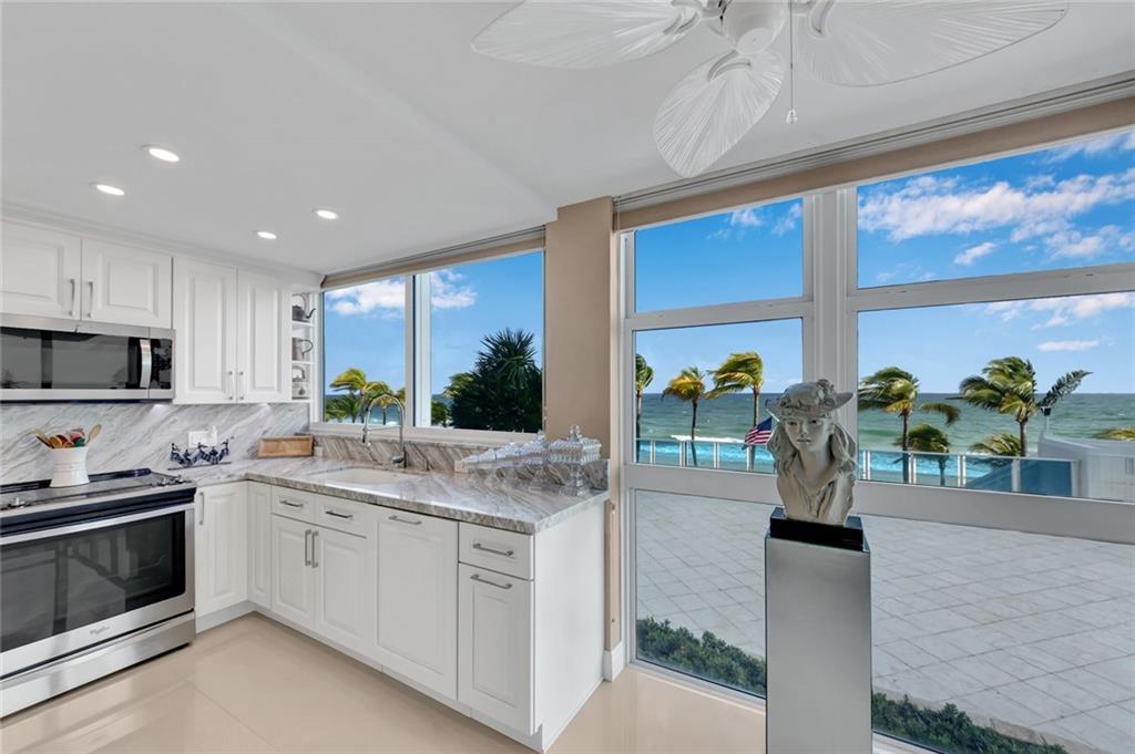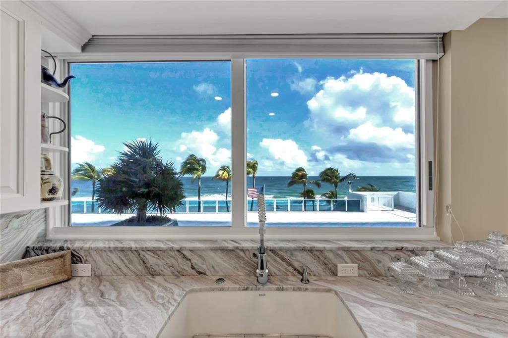 Million Dollar, full oceanfront views visible from every angle in this beautiful condo. Wake up to breathtaking sunrises, just steps away from the private beach. One of the few largest corner units, with wrap around balcony and unobstructed views of the ocean. Immaculate, fully renovated two-bedroom, split floorplan with 2.5 bathrooms, walk-in closets and an abundance of natural light with floor to ceiling impact windows. Gourmet kitchen offers an 8 FT island with lots of storage and a washer and dryer inside the unit. High end rectified porcelain tile flooring throughout with finishes in neutral tones. Amenities include pool, tennis courts, sauna, jacuzzi, gym, ballroom, 24-hour security, covered parking garage and a storage unit. Corner units rarely available. MUST SEE!