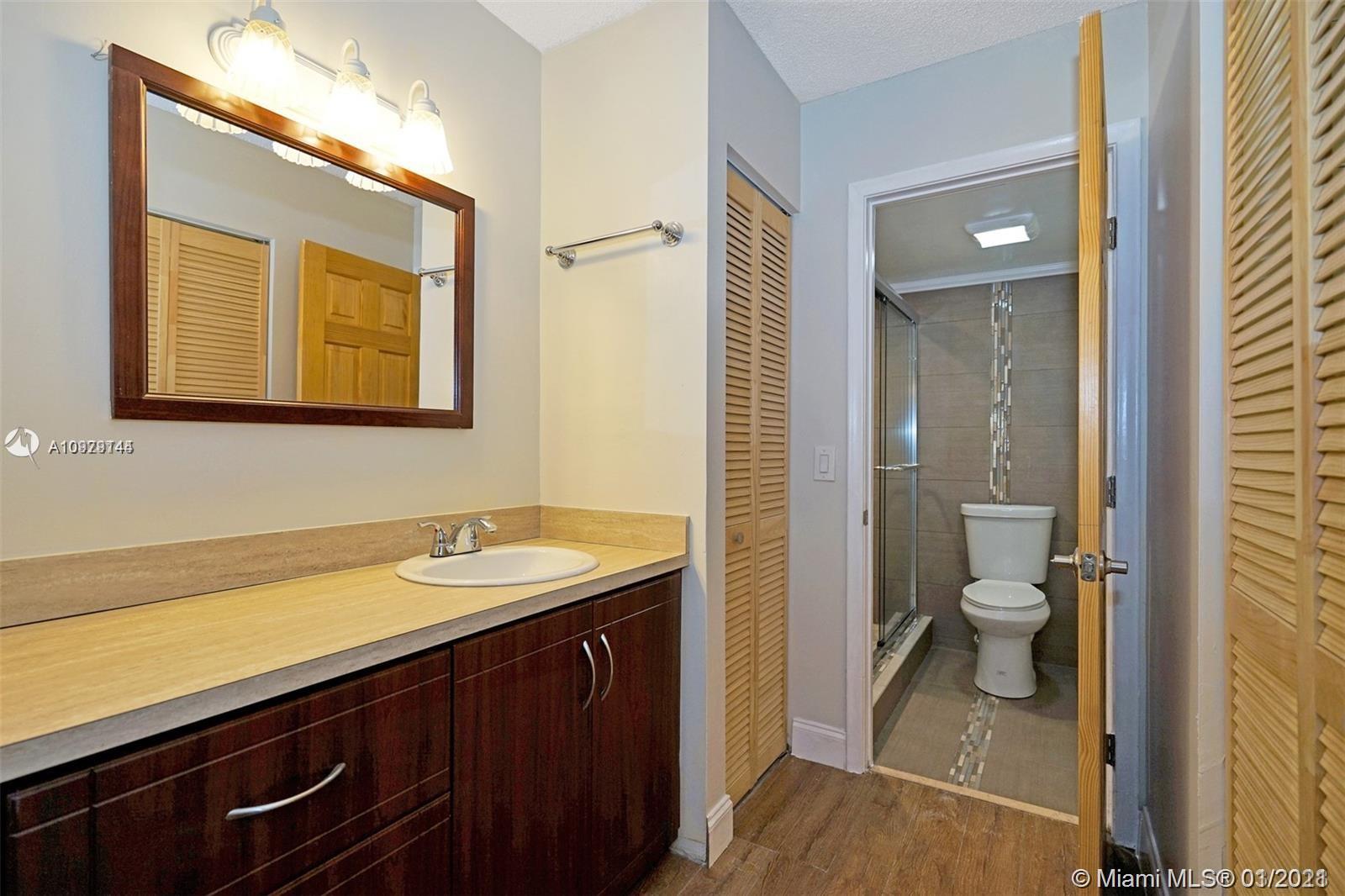Investors welcomed! Ground floor 2 bedroom 2 bathroom with upgraded kitchen cabinets. Breakfast nook and a galley kitchen that leads to the dining room living room area. Tastefully remodeled master bathroom with shower glass doors. Enclosed patio, hurricane shutters, and modern appliances. Pool view and a peaceful view of the decorative and manicured landscaping. In the most exclusive 55 plus community in Pembroke Pines! Take pleasure resort style living community with million dollar clubhouse, bus transportation,2 fitness centers, 24 hrs. security, 8 swimming pools, tennis, movies, theater, billiards, pharmacy, café, golf, and much more